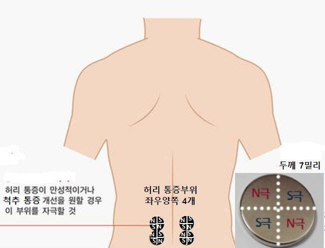 특수자석 27밀리를 붙혀주면 허리통증 디스크증상 척추관협착증에 치료효과 좋습니다