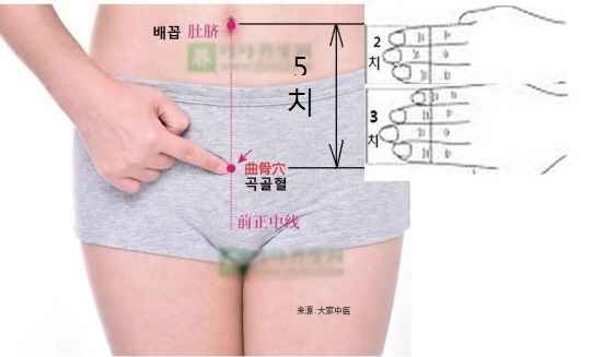 본인 손을 측정한 길이를 가지고 배꼽아래 곡골혈 길이를 가늠하시면 됩니다