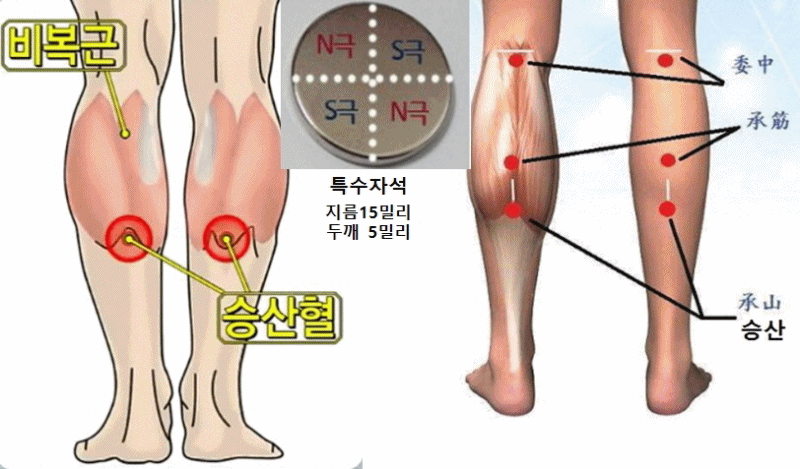 무릎오금 위중혈과 장딴지 중앙 승산혈에 특수자석을 붙혀줍니다