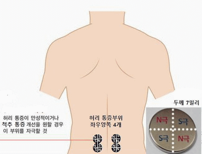 요추 4~5번 좌우 양쪽에 대형 특수자석 4개를 붙혀줍니다