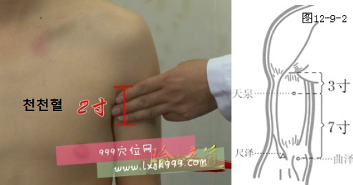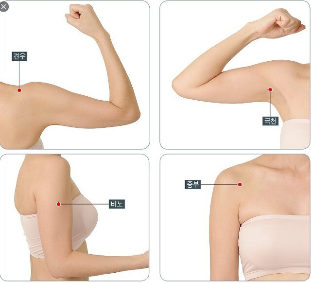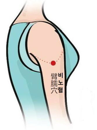 어깨바깥쪽 비노혈과 어깨관절 안쪽 천천혈을 눌러보아