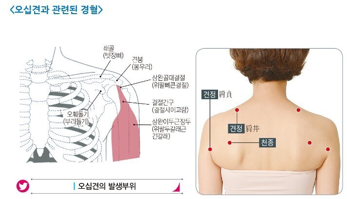 오십견이 있는 경우 비노혈과 천천혈에 통증이 있는 경우가 많습니다