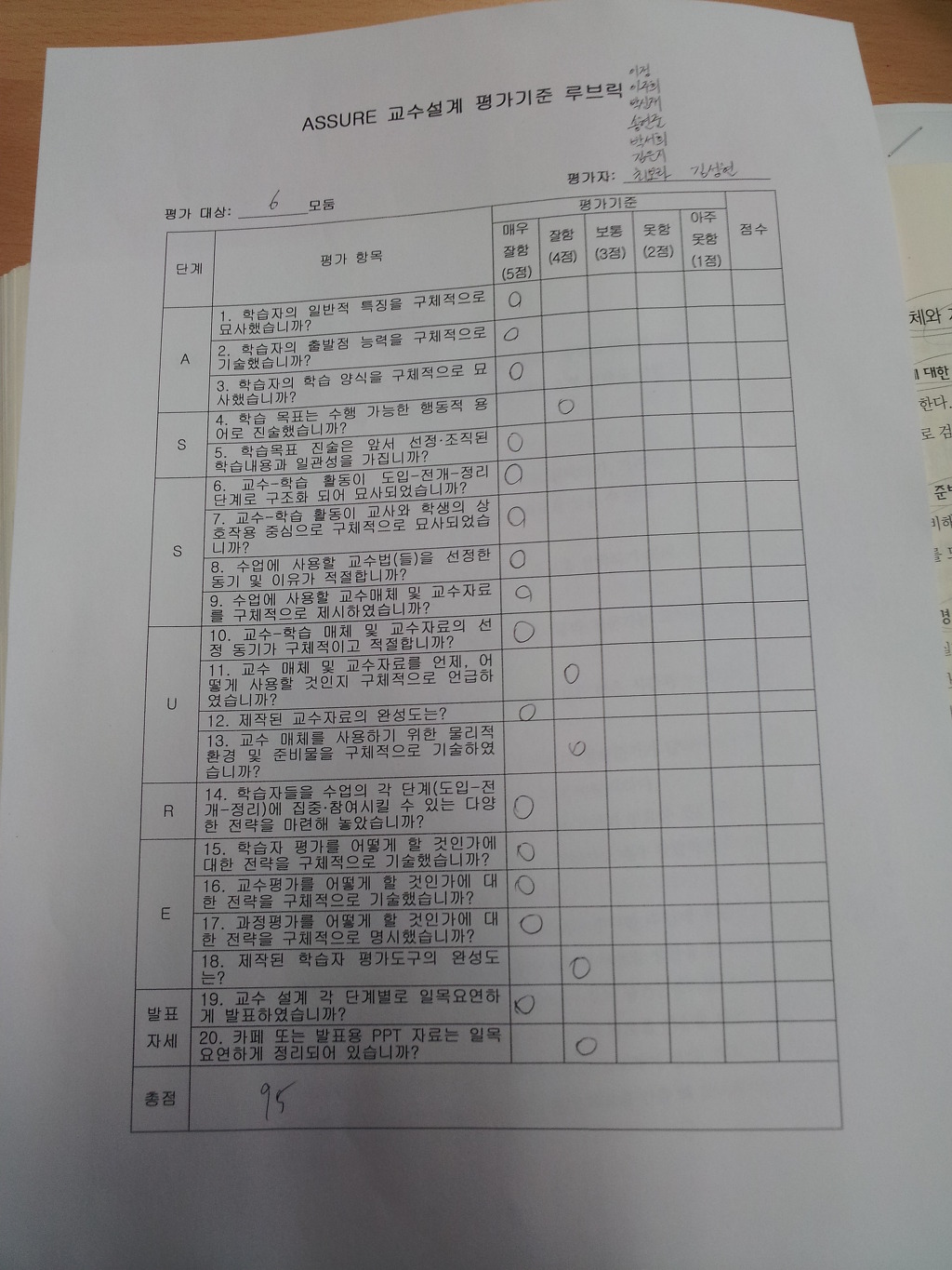 루브릭 평가표의 내용입니닷!!! 작성자화교12이주희|작성시간13.05.22|조회수726 목록 댓글 0 글자크기 작게가 글자크기 크게가 오늘 1조 유아교육과 동질집단의 첫번째 수업시연 발표가 있었습니다!!! ASSURE모형에 따른 수업시연을 위해서!!!! 참고하세요~~~~ 다음검색 현재 게시글 추가 기능 열기 북마크 공유하기 신고 센터로 신고 댓글 댓글 0 댓글쓰기 답글쓰기 댓글 리스트