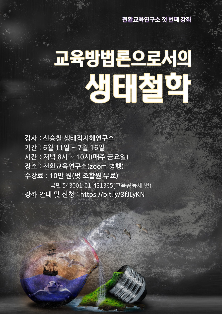 우리가 목도하는 기후위기, 환경 오염, 자원 고갈, 코로나 팬데믹, 불평등 문제 등은 근본적인 삶의 전환을 요청한다. 그리고 이러한 전환은 교육을 통해 가능하다. 근대적 지식 체계를 재구성하거나 재배열하는 것도 중요하지만 그것을 “어떻게(How)” ‘앎과 함’으로 연결할 것인가도 중요하다. 교육의 내용뿐만 아니라 방법론에서도 근본적인 전환이 필요하다. 생태철학은 교육의 방법론에 대해서도 많은 것을 알려주고 있다. 특히 생태적 지혜와 정동(affect)에 대한 깊은 이해는 방법론적 전환으로 이어질 가능성을 내포하고 있다. 방법론은 수업 기술이 아니라 사실상 인식론의 전환을 의미하고 그런 의미에서는 그 자체로 내용이기도 하다. 이 강좌는 생태철학에 내포되어 있는 교육방법론을 탐색하는 자리이고, 선험적인 책임 주체를 만드는 근대적 교육방법론을 넘어, 너와 나 사이에서 주체를 형성하는 방법론을 익히는 여정이 될 것이다.