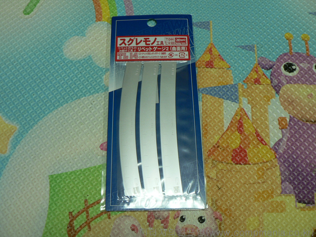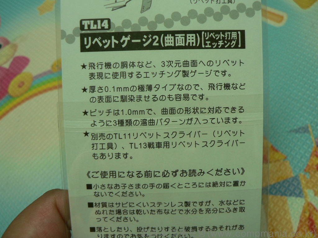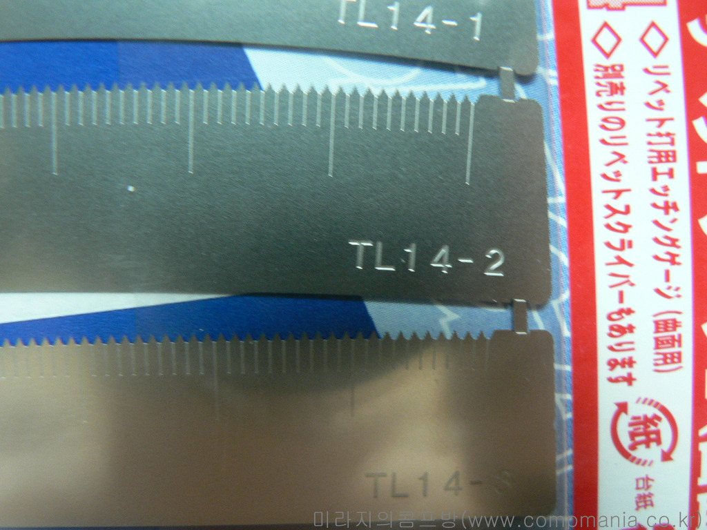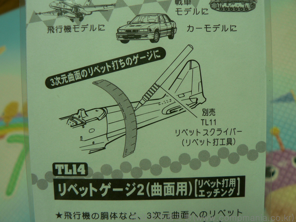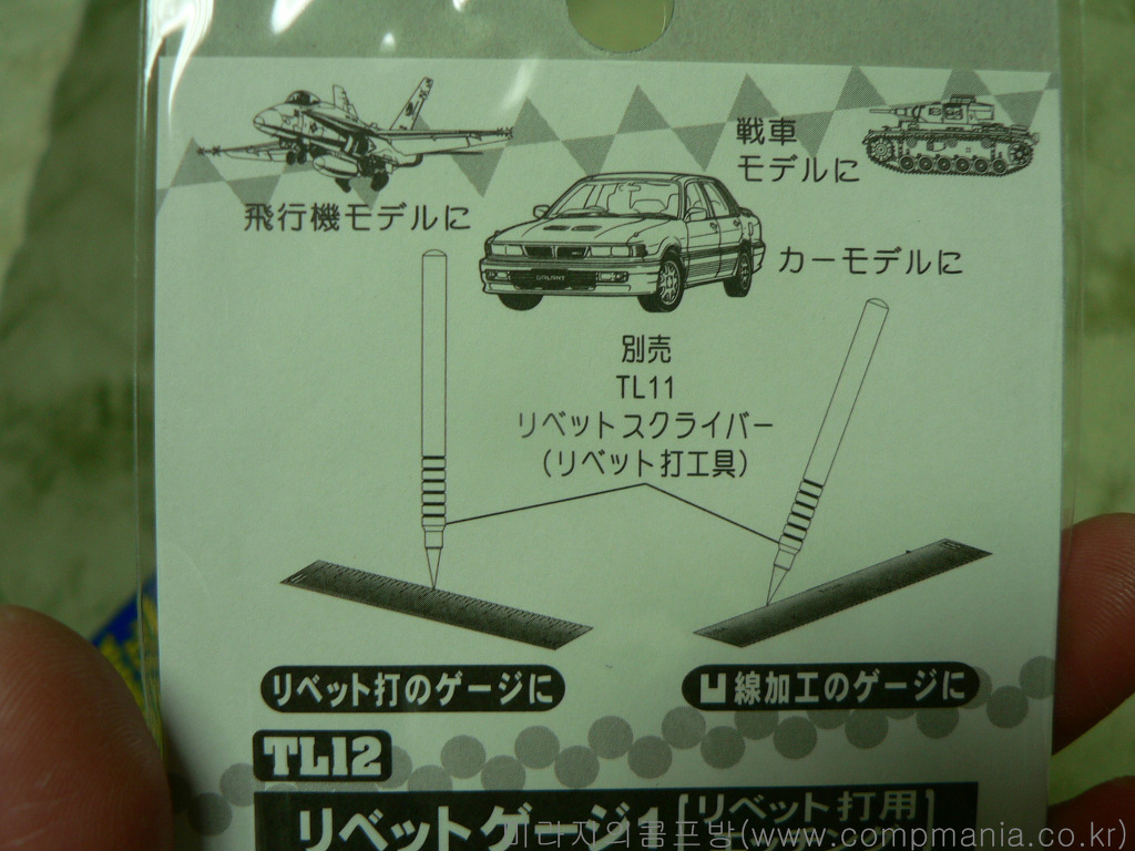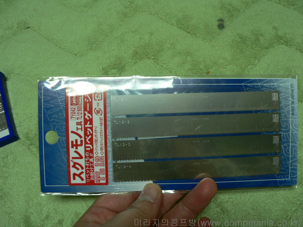[하세가와 리벳게이지 TL12번 이건 리벳을 찍기위한 전용 템플릿으로 크기와 간격이 각기 다른 4장의 템플릿이 들어있다. 2010년 6월기준 900엔 국내소비자가 약 11,700원]