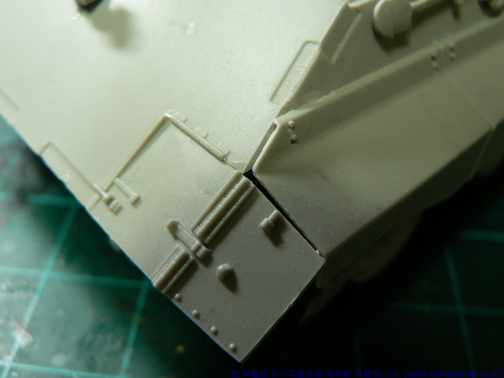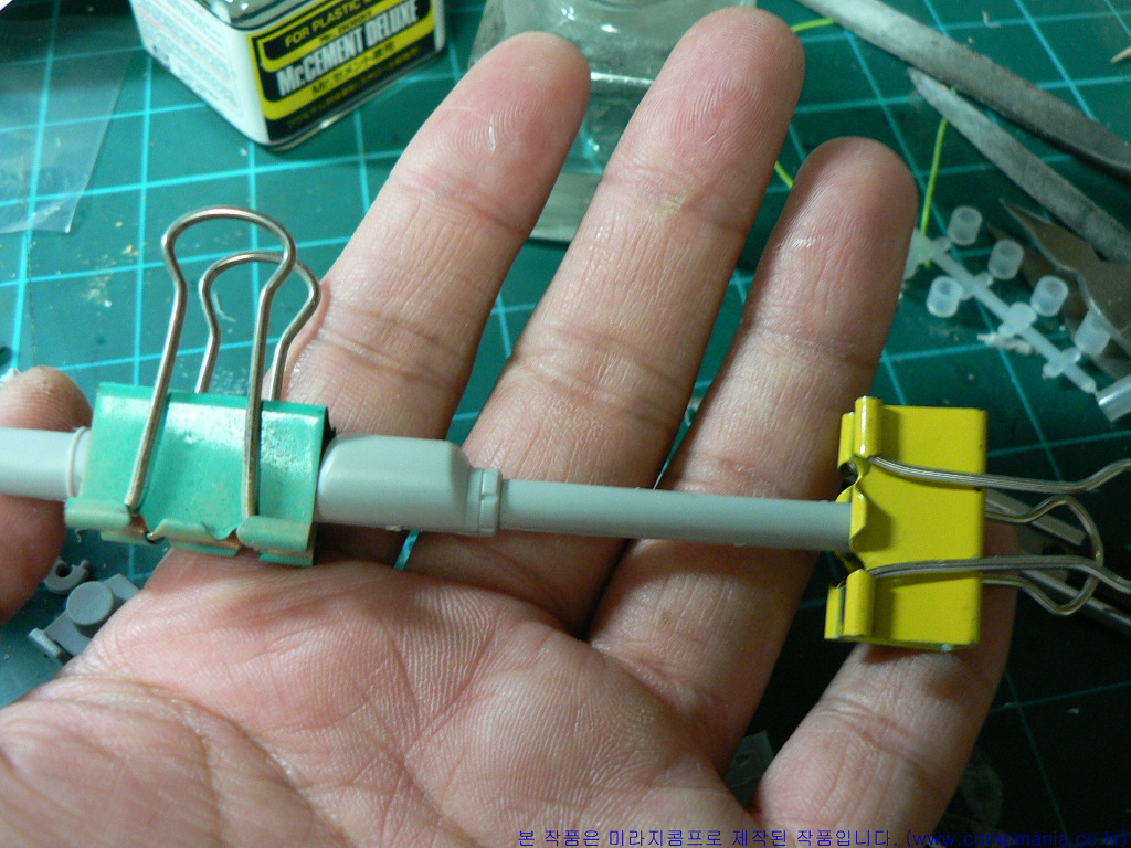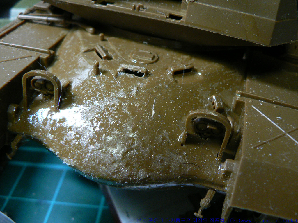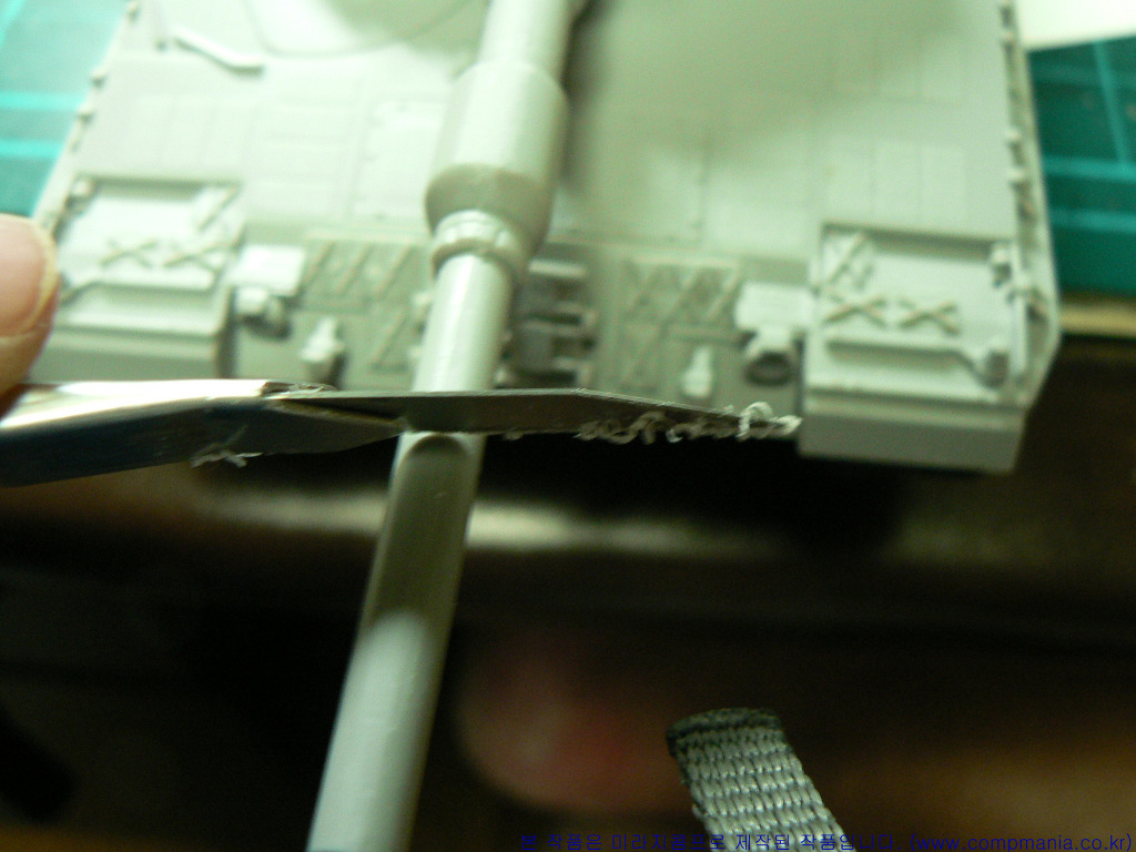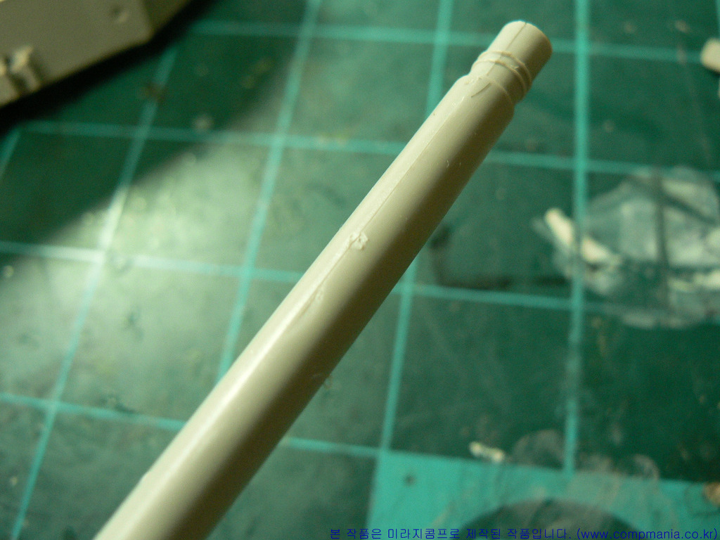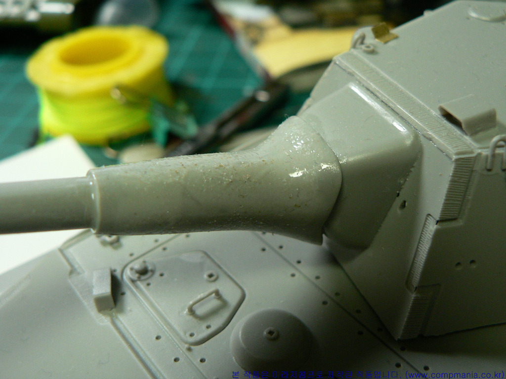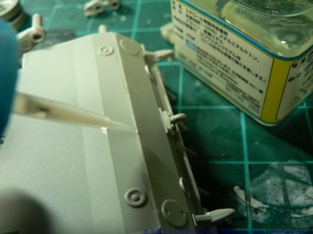 [삐져나온 부품은 칼날을 세워 깍아내주고 사포로 마무리 하면 별도의 퍼티칠 없이 말끔하게 수정이 가능합니다. 주로 포신같은 부품에 아주 유용합니다.