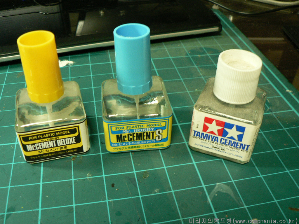 [접착제는 군제사에서도 판매중에 있다 군제는 노란색이 수지 하늘색 두껑이 무수지 접착제 이다. 효과나 성분은 타미야와 거의 비슷 가격은 오히려 좀더 싸다]