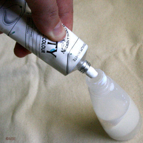3) 아크릴 물감을 혼합하기 위하여 물로서 용해할 때 붓을 강하게 문질러 사용하면 거품이 생기기 쉬우므로 유리봉이나 스텐나이프 등으로 조심스럽게 사용하는 것이 좋다.