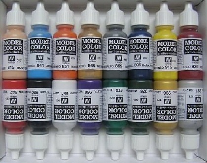 특히 아크릴도료중 발색이 뛰어난 제품으로는 스페인에서 제작되어진 Vallejo (보통 발레죠 혹은 요새는 원어의 느낌을 살려 바예호 라고 발음한다) 사의 아크릴도료는 아크릴도료중 최고의 색감과 발색을 가진 도료로 정평이 나 있는 도료중 하나입니다. (외국의 이름난 모델작가들은 거의 모두 이 회사 제품을 쓴다..)
