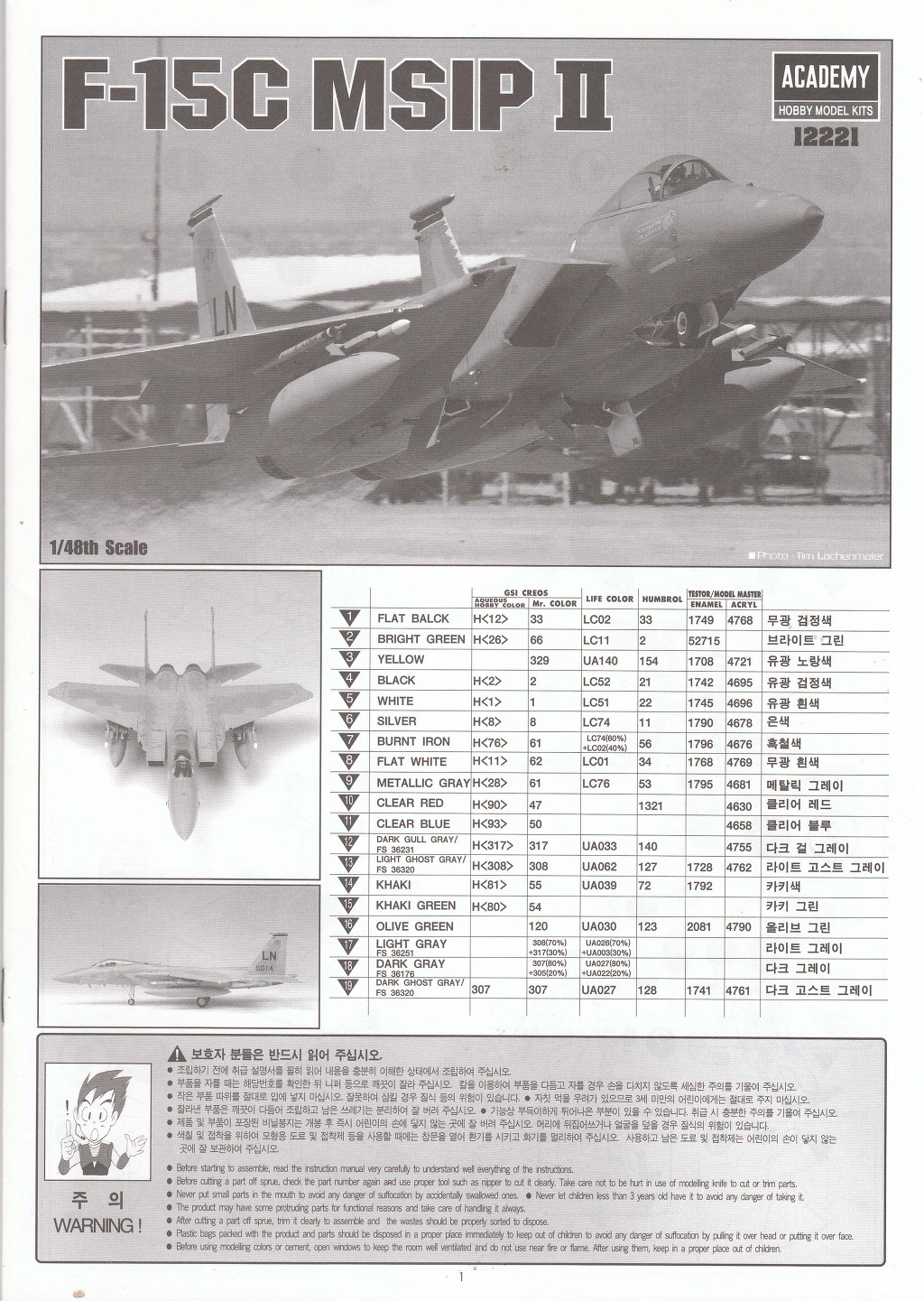 [최근발매된 아카데미의 F-15C MSIP II 의 메뉴얼.. 군제락카와 모델마스터 등 유명한 도료의 색번호는 지정하고 있지만 타미야 도료만큼은 생략하고 있다. 이는 비단 아카데미만의 문제가 아닌 전 모형메이커등의 공통적인 현상인데.. 타미야 에나멜 제품의 왕따는 이런 메이커들의 의해 공공연히 일어나고 있다]