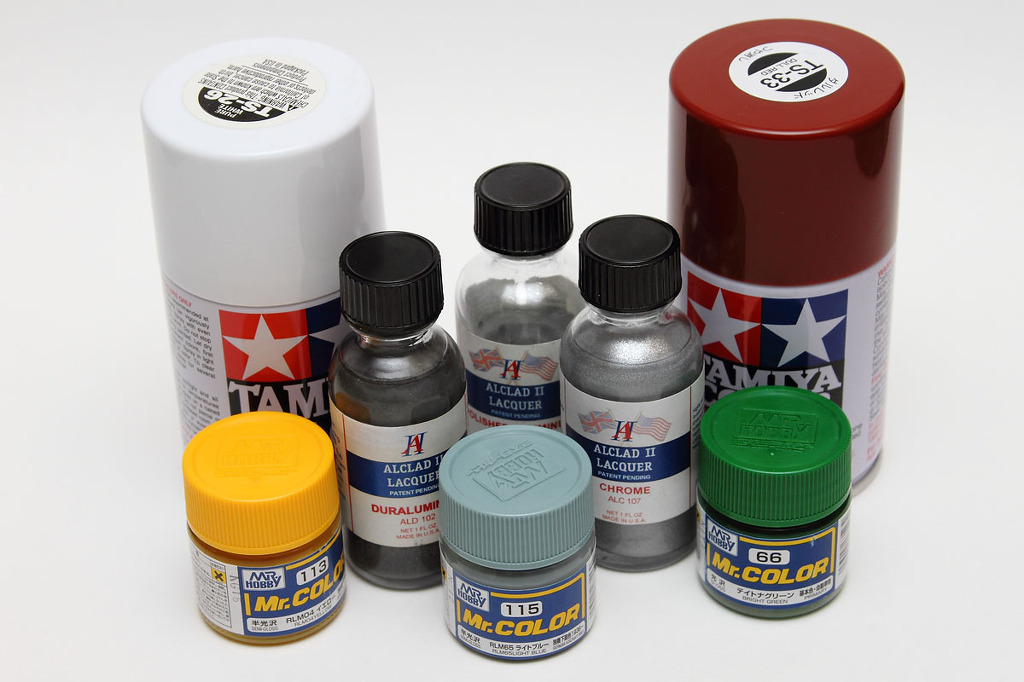 [최신 모형도료는 건강과 친환경도료로 아크릴 도료가 급부상중에 있다. 이 도료는 락카와 비슷한 성분이지만 수용성 바니쉬의 일종으로 아크릴 수지를 사용하며 냄새가 적고 인체에 무해하다는 장점이 있다. 최근 아크릴도료의 주요 3총사 군제 미스터호비 (좌) 바예호 (우) 모델마스터의 아크릴 도료(아래) 타미야 역시 위에 소개했듯 아크릴 도료를 출시중에 있지만 이들 도료에 밀려 고전을 금치 못하고 있다]