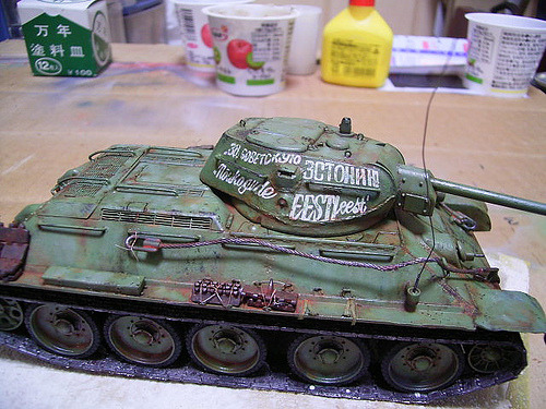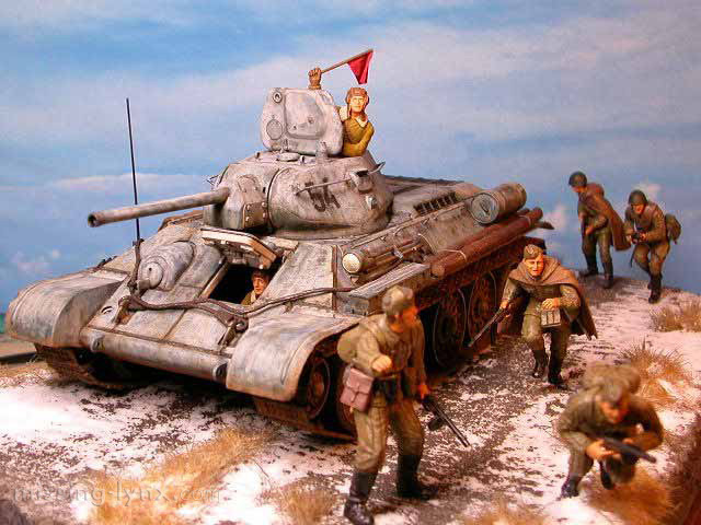 [타미야가 원하는건 이런것이다. 자사의 T-34/73 전차와 역시 자사의 소련군 인형 그리고 이것들을 칠한도료는 타미야의 에나멜 도료이고.. 웨더링 역시 타미야의 정경파스텔 이다.. 타미야는 철저하게 모형업체로서 자사의 제품을 판매하는데만 에나멜 도료를 적극 활용했다. 이것이 도료제작 전문업체인 군제산업이나 모델마스터 와 모형업체인 타미야의 차이점이다]