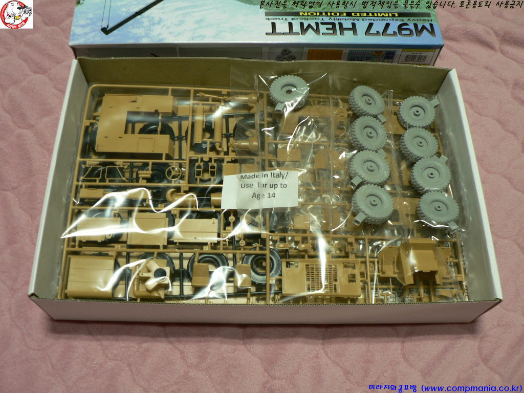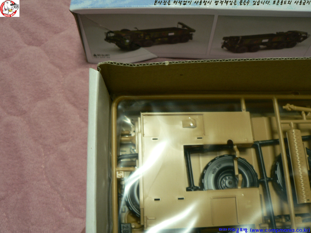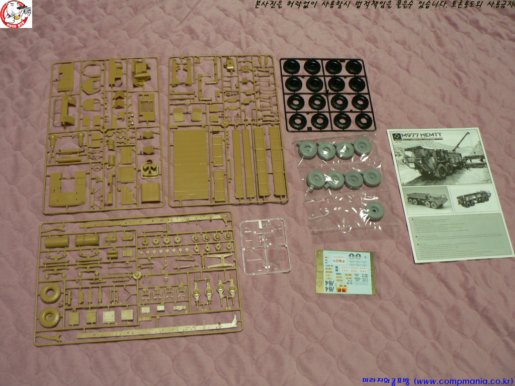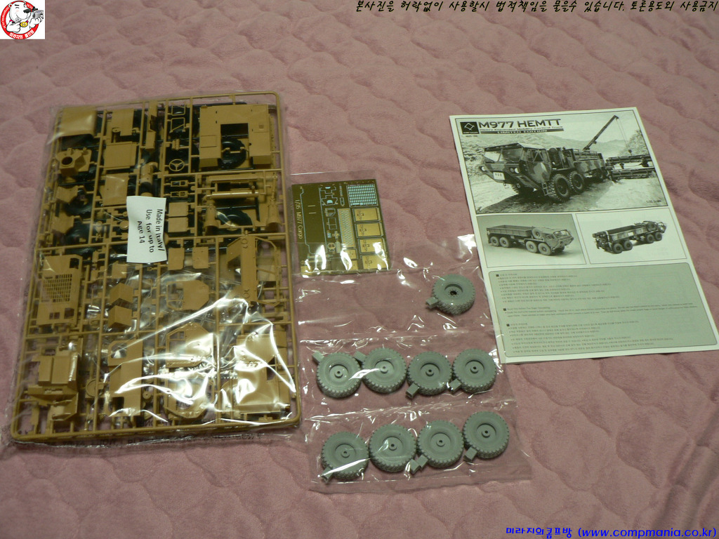 [제품구성은 이렇습니다. 벌크로 수입된 이탈래리제 m977 런너한봉과 국내에서 제작된 레진제 바퀴와 에칭부품 그리고 데칼과 메뉴얼 입니다.]