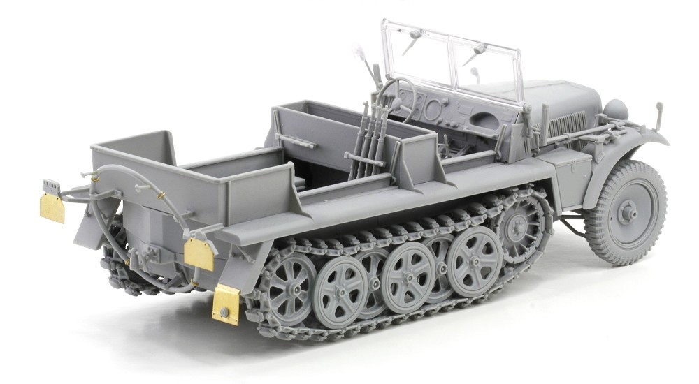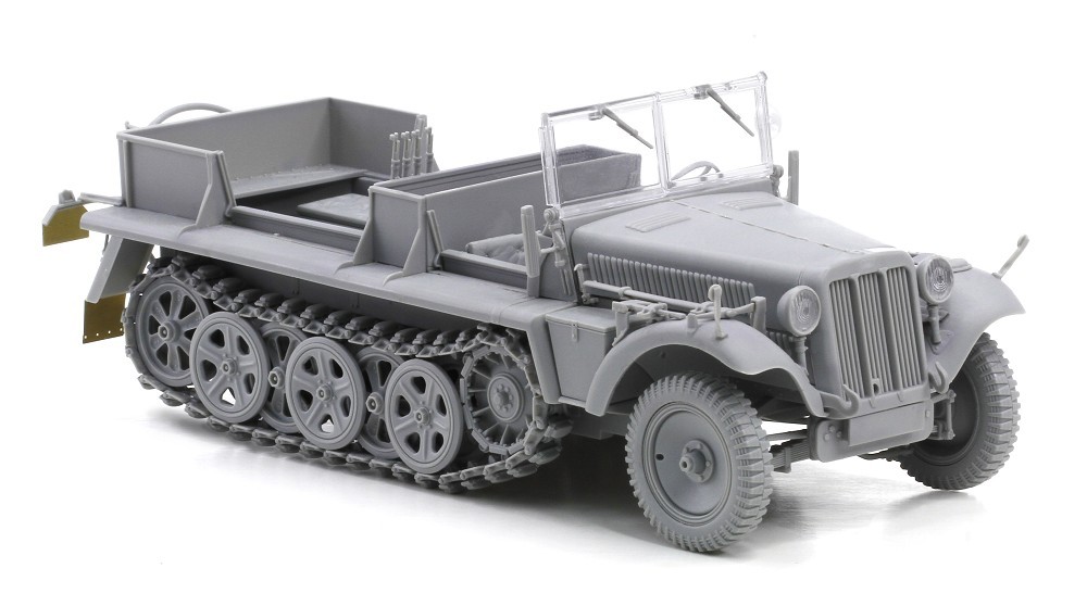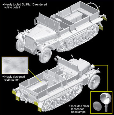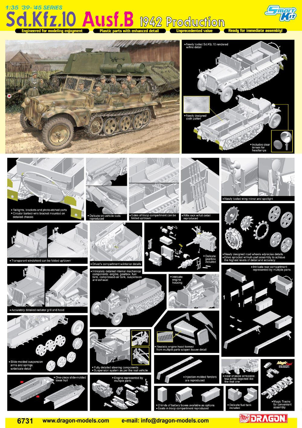 Dragon is proud to announce the arrival of its long-awaited kit of a 1/35 scale Sd.Kfz.10 halftrack. This important kit helps fill an important gap in model coverage of Germany's numerous halftrack types. The Sd.Kfz.10 was a light design in the 1-ton-payload class that was intended as a prime mover for small towed guns such as the 3.7cm PaK 35/36 or 2cm FlaK 30. Its total capacity was eight troops. Demag delivered the first vehicles in 1938, but eventually seven factories were involved in producing approximately 14,000 examples. Dragon's kit represents an Ausf.B model from the 1942 time period. While the Sd.Kfz.10 was conceived as a prime mover, it was also commonly used as a personnel carrier, as shown in the box top artwork. Reviews: Sd.Kfz.10 Ausf.B 1942 Production