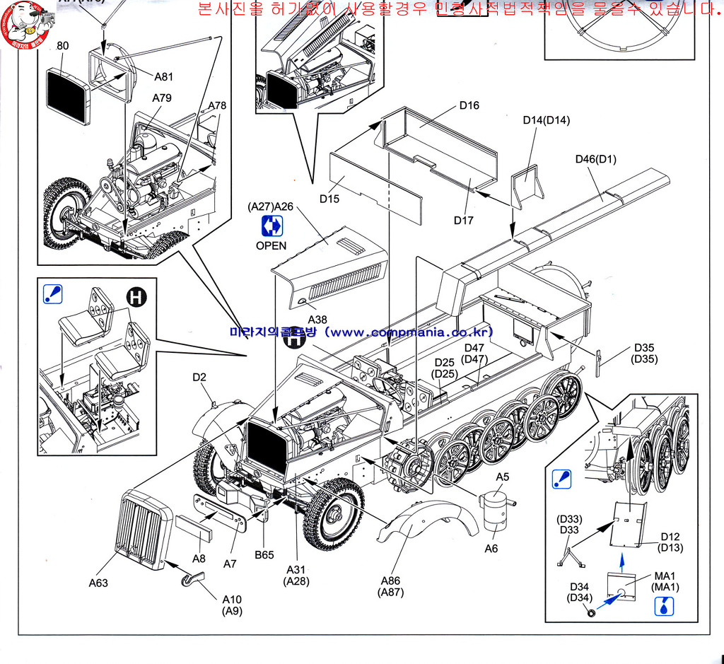 The kit contents rattle around to a surprising degree once all the packaging has ben removed....which is an indication of the diminutive size of this model once it's finished....that and the absence of any mounted or towed gun of course. The contents are almost identical to the Cyber-Hobby white box Ausf.A version kit no.6630, released in November of last year. The only differences are the decal sheet, the one included in this kit still being a generic sheet, but without the two completed number plates that were included in 6630, the addition of a Notek rear convoy light and a small exhaust cover to sprue B, the latter being marked as 'not for use' anyway, the substitution of the roadwheels to a new set of pressed inner and ribbed outer set, and the option of a slightly different towing pintle assembly at the rear.