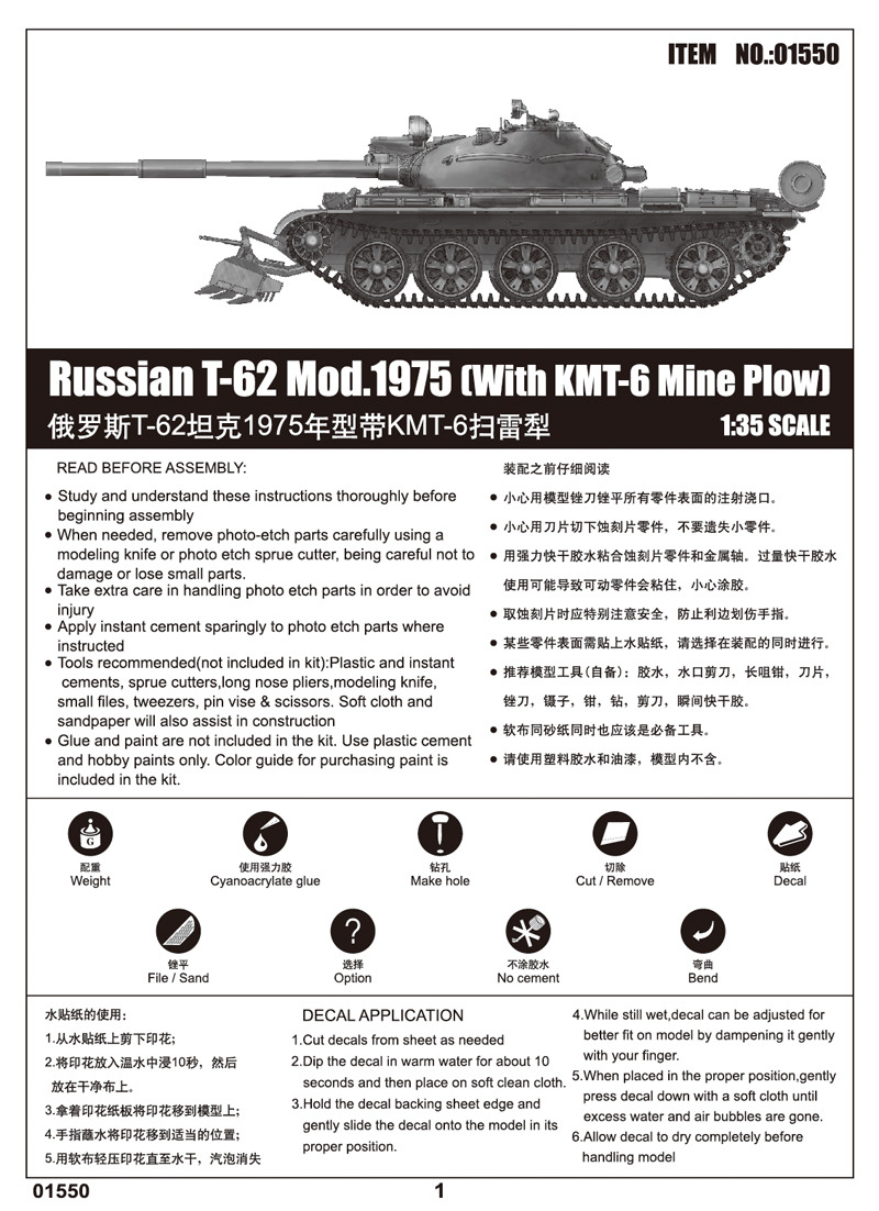 이중 01550번 Russian T-62 Mod.1975 (With KMT-6 Mine Plow)이란 제품을 소개합니다.