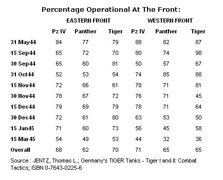 즉 총 차량 숫자 대비 운용가능 차량 숫자를 따져보면 무난한 수준. 전시 가동율이라는 통계가 갖는 허상 때문에 그런 경향이 더욱 강하게 퍼졌는데, 사실 티거의 가동율이 낮다고 까이는 시기를 보면 다른 전차들의 가동율은 훨씬 낮고 이중 대부분은 애초에 정원조차 채우지 못한 상태인 탓이 크다. 아예 대파돼서 회수, 공장에 들어간 장기수리 차량도 대대/연대 보유 차량에서 빠지지 않는 것이다.