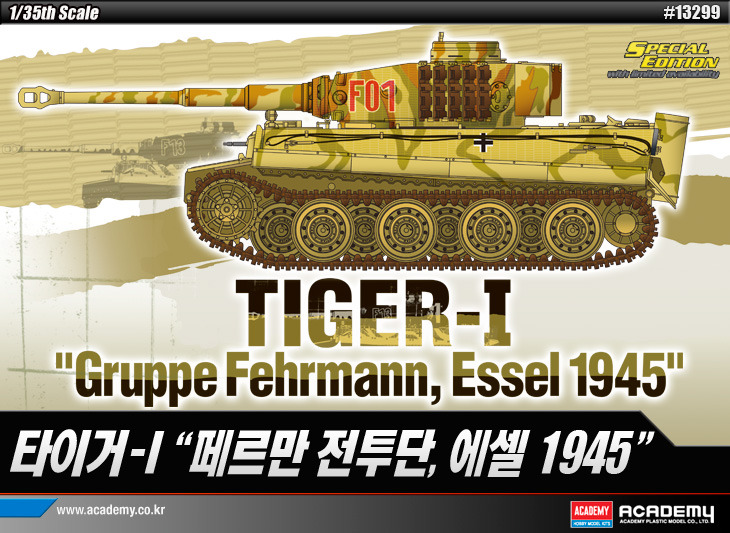 지난번에 말씀드린 아카데미 11월 신제품이 13299번 1/35 TIGER-I "Gruppe Fehrmann, Essel 1945" 페르햄 전투단 1945년 버젼이 어제 전격적으로 출시되었습니다.