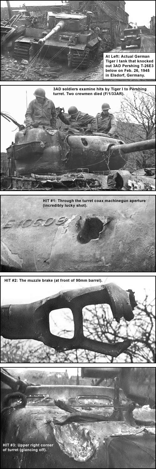 [대전후반에 이르면 엽합군에서도 티거에 맞설 전차를 개발하게 되는데 그중 하나가 미군의 M26 퍼싱 전차였다 강력한 90mm 주포를 탑재한 이전차는 유일하게 티거를 정면에서 맞서 이길수 있는 전차로 대전 후반에 티거와 맞붙기도 했다. 결과는 판정승.. 티거의 88밀리 주포에 맞은 퍼싱전차를 이처럼 주포가 나가고 포방패의 일부가 파손되었다, 이 전차와 맞선 전차는 이어 동료전차에 의해 피격되어 불타올랐다고 한다]