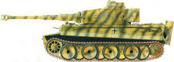 [1942년말 북아프리카에 파견된 501중전차대대소속의 차량들은 데저트옐로루 (RAL 8020)으로 도색되었다. 데져트옐로우는 티거전차의 거의 표준도색으로 불리는 색으로 여기에 녹색의 거느다란 선이 더해지거나 갈색이 추가되기도 하면서 점차 다양한 위장패턴이 등장하게 된다]