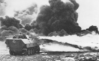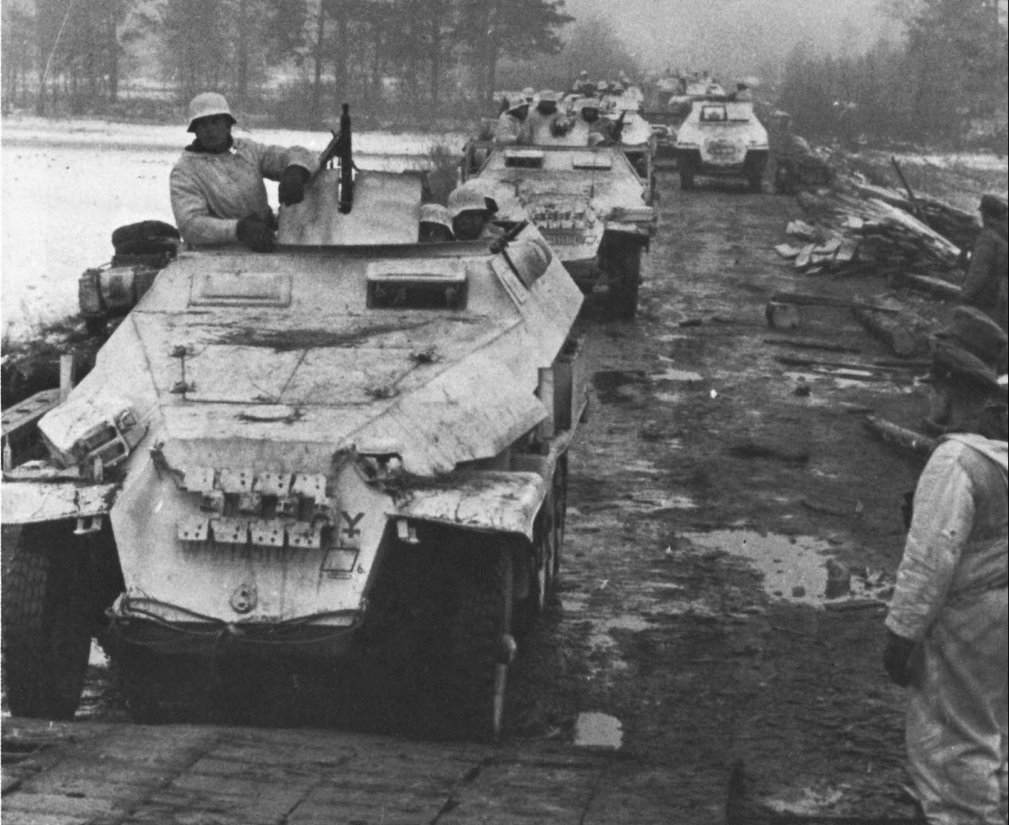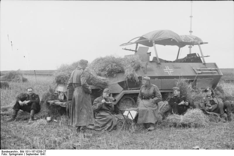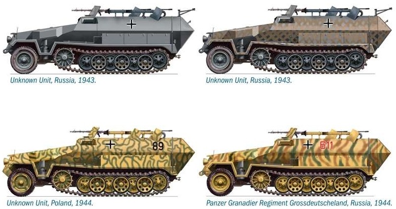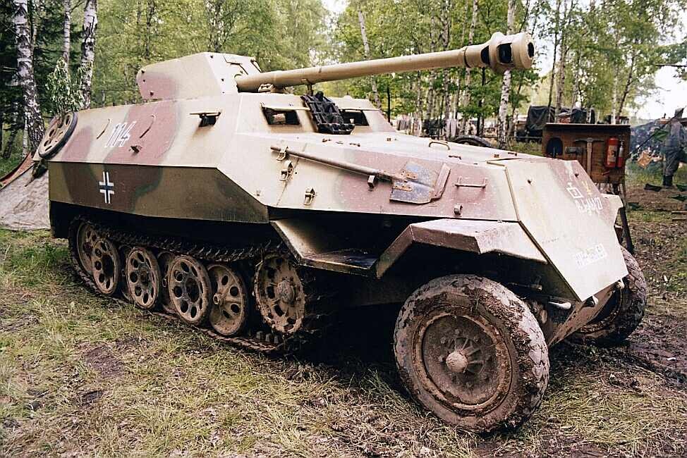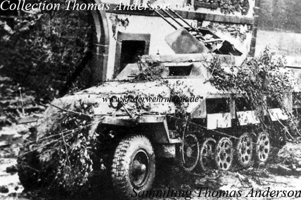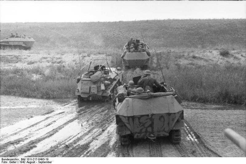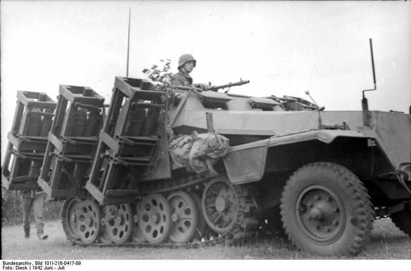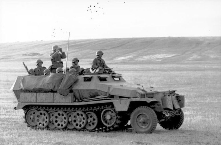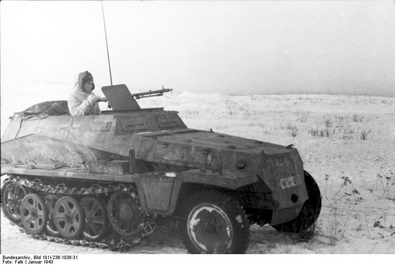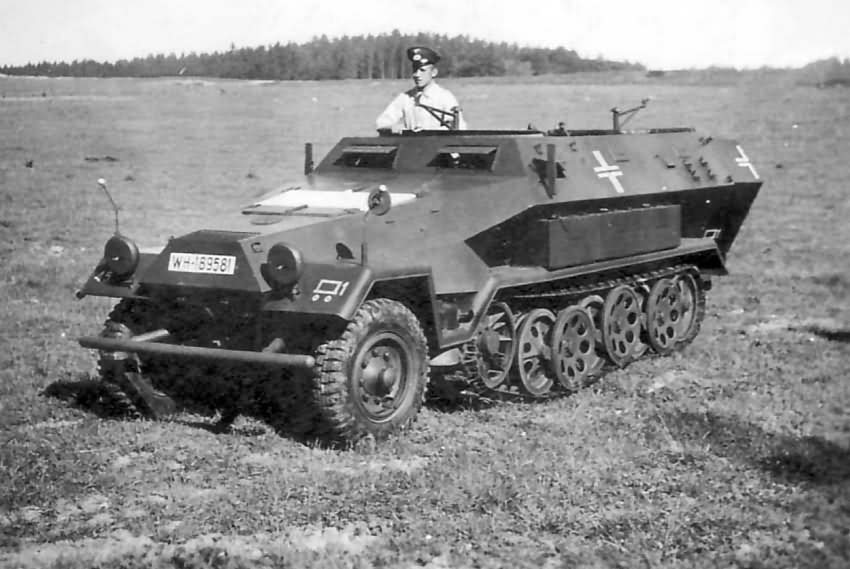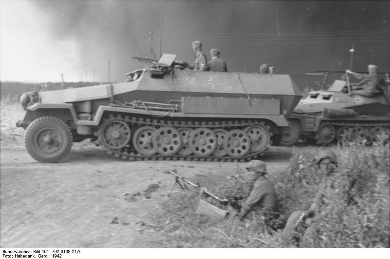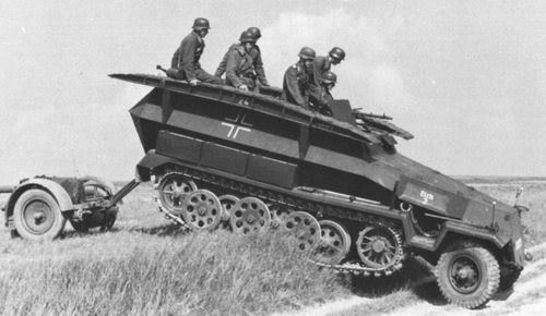 [Sd.Kfz. 251 반궤도 장갑차는 여러모로 독일군의 아이콘이다. 보병 수송칸 앞쪽에 MG42 기관총이 장착되어 있어 적 대전차 보병에 대한 견제가 가능했다. 병사들은 견인 대전차포를 방열하는데 걸리는 시간을 줄이기 위해 그냥 여기에 견인 대전차포를 올려서 사용하기도 했다. 이 아이디어는 개발자들에게 피드백되어 공장에서 견인 대전차포를 고정할 수 있는 부품이 부착되어 출고 되었으며 아예 대전차포를 고정장비한 모델도 생산되었다. 그외에도 박격포나 대공포, 화염방사기등 쓸만한 것들은 다 올려서 사용하였고 역시 이런 무기들을 고정장비한 모델이 나왔다. 상부를 장갑판으로 덮고 Sd.kfz.222의 20mm포탑을 탑재한 정찰형 등 파생형들이 엄청나다] [통상적인 기본형 타입은 37밀리 대전차포등을 메달고 다녔다 그리고 장갑차에는 운영병사들이 탑승하는 방식] [반궤도 장갑차의 특징인 진흙탕 같은 험지돌파력이 우수한것은 이 차량의 최대장점]