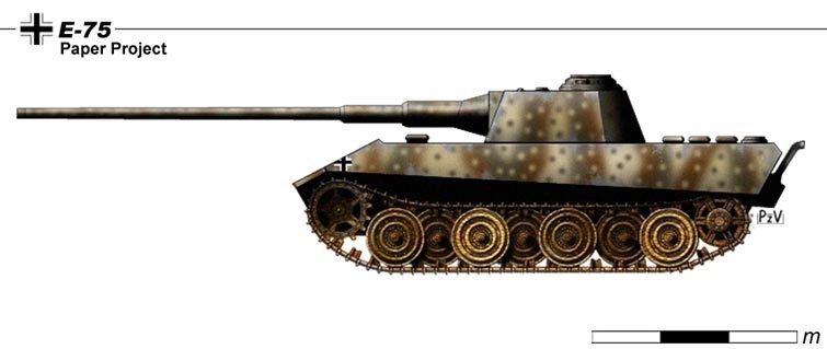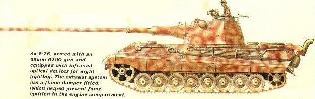 <E-75 88mm kwk L/100의 일러스트 E-75 역시 88밀리 포의 업그래이드 형인 100구경 짜리 포를 장착한 타입을 고려해두고 있었다. 하지만 현재도 52구경장에 머물고 있는 장포신의 장착이 과연 가능했을지는..>
