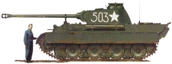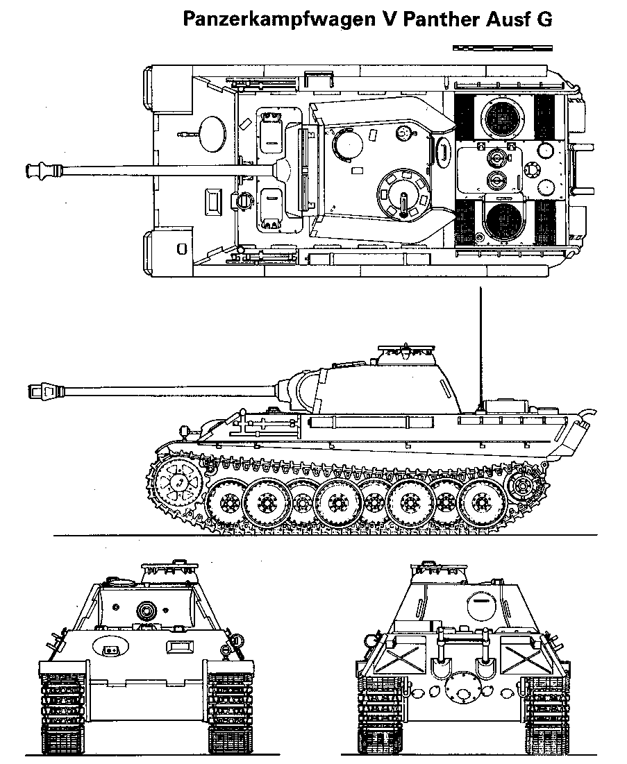 [판터 전차의 장갑은 정면을 빼고는 그리 두텁지 않았는데 이 전차를 6호전차 티이거와는 달리 공수의 밸런스를 중요시한 中전차였기 때문이다. 하지만 정면의 장갑은 티이거에 견줄정도로 두터웠으며 여기에 경사장갑을 도입 200밀리급 장갑방호력을 가질수 있었다. 하지만 측면의 경우 경사장갑이 도입되긴 했으나 차체의 한계로 인해 그리 두꺼운 장갑을 두를수 없었다]