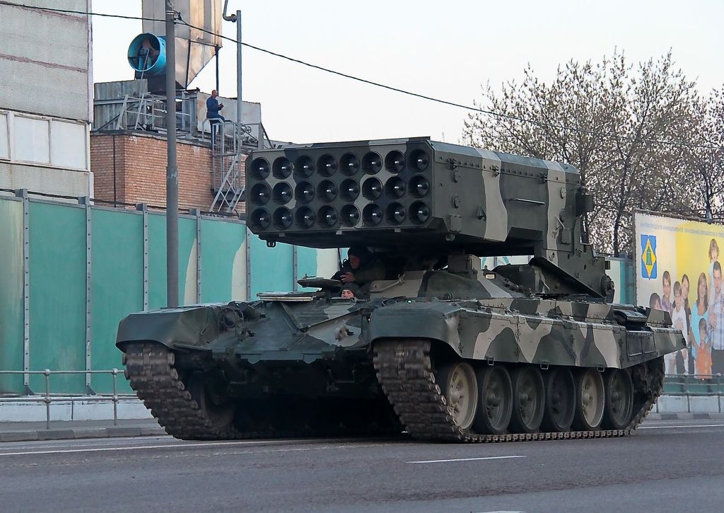 [체첸사태 이후 러시아군은 대대적인 군개혁과 더불어 새로운 무기들을 개발하게 된다 사진의 TOS-1 TOS-1A 부란티노(Burantino) 220mm 다연장로켓도 그중하나로.. 열압력탄두로 채워진 220~230밀리 다연장로켓으로 시가지의 건물을 모두 날려버리는 전술을 이용하게 된다]