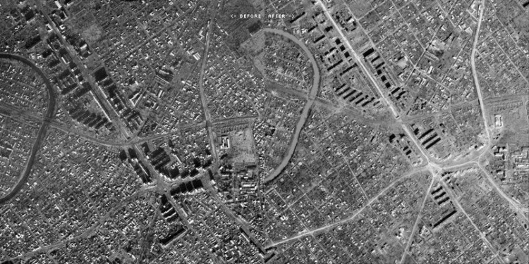 [부란티노의 공격을 받기전과 (좌) 받은후 (우) 의 항공촬영사진 사진에서 보듯 거의 모든 건물에 초토화되었음을 잘 알수 있다 현재의 러시아군은 과거 건물하나하나를 청소하기보다는 아예 시가지를 청소하는 새로운 새로운 시가전 전술을 확립하였다]