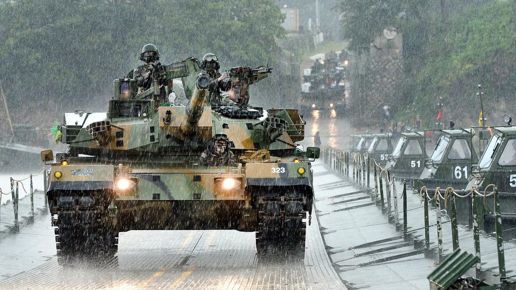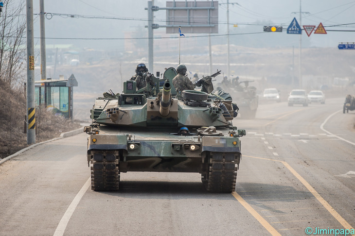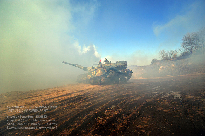 [K1A1 의 시원스런 주행모습..K1A1 은 120밀리 주포를 장착한 3세대전차중 가장 낮은 차체를 가진 전차로 이는 전장에서 탐지률을 크게 줄여 생존성을 극대화 시키는 설계이다.]