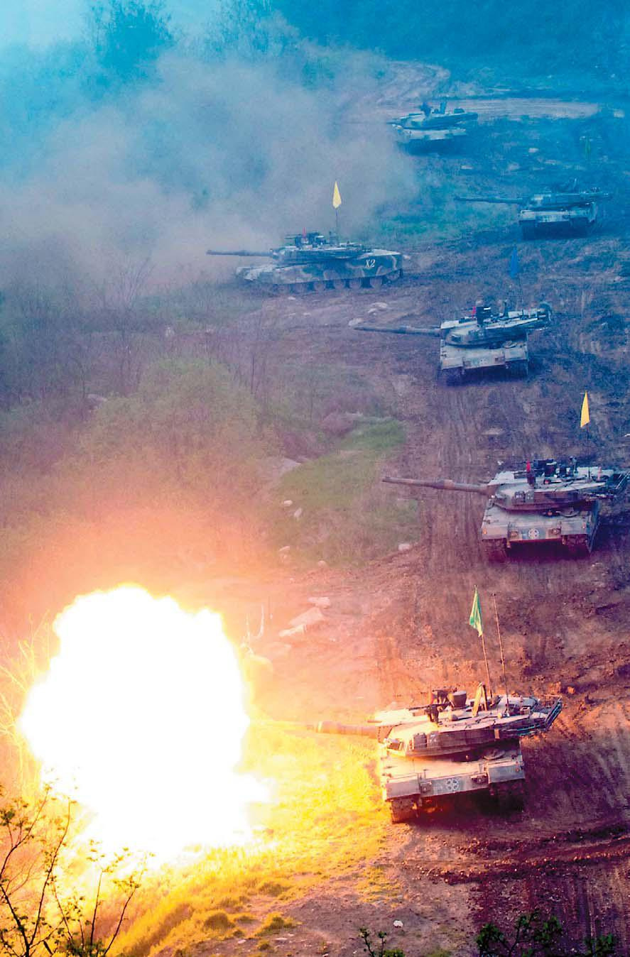 [강렬한 화염을 분출하며 포발사를 하는 K1A1 의 모습.. K1A1 이 장착한 120밀리 M256 포의 최대 사거리는 3,500미터 정도로 한반도의 좁은 지형특성상 거의 모든 북한군 전차를 2킬로 이상에서 격파가 가능하다]