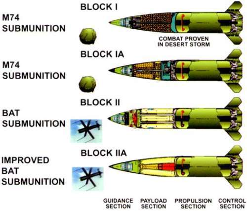[자탄이 가득한 M39 에이테킴스 ATACMS(Army TACtical Missile System) 탄도탄 탄두의 모습 야구공 크기 정도의 자탄은 하나하나 수류탄 이상의 폭발력을 가진 폭탄으로 사방 400X400 미터 지역의 모든 차량과 병력을 초토화시킬수 있다]