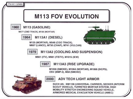 거기에다 가격도 싸졌기에 미 육군은 M113의 성능에 만족하여 빠른 양산을 추진했고 M113/A1/A2/A3/A4으로 개량되고 각종 파생형까지 더해가며 무려 8만여대나 생산되었다.