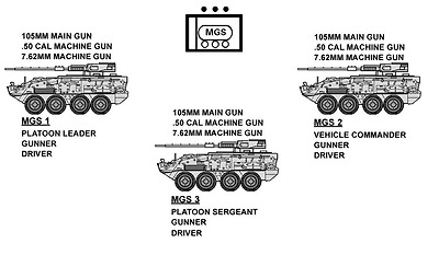 MI 전차와 동일한 사격통제장치와 120mm 전차포와 유사한 화력을 가진 M68A1 105mm포(M900 APFSDS-Tracer탄 사용) 탑재차(MGS : Mobile Gun System), 대전차 미사일 탑재차, 정찰차, 화생방정찰차 등 10가지의 버전이 있으며, 미 육군에서는 총 2000여대를 생산하여, 각기 300여대 이상의 Stryker차량을 보유한 6개의 중무장 여단 전투단을 배치할 계획이다.