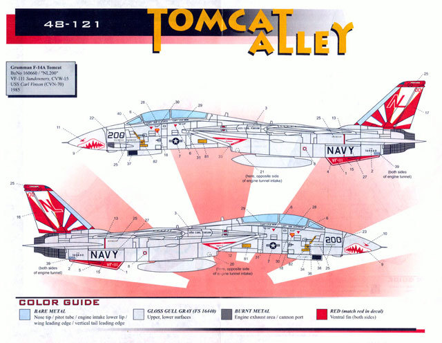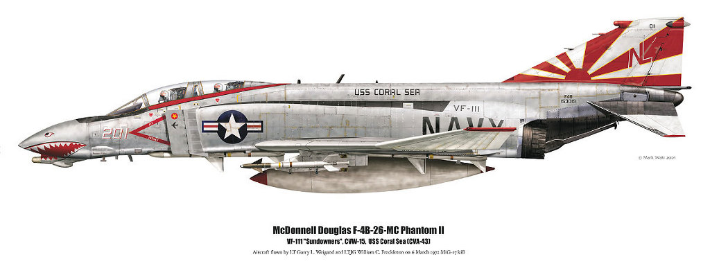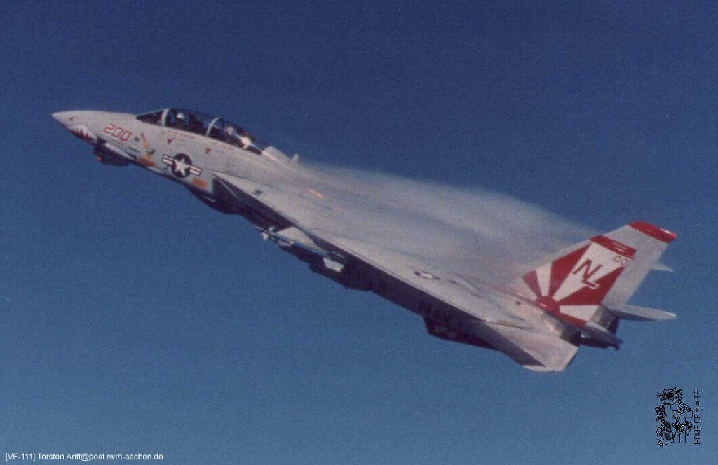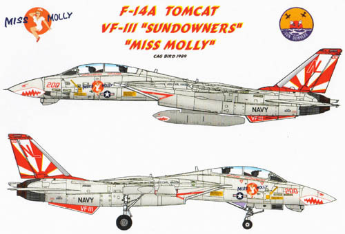 VF-111 "Sundowners" 는 2차대전중인 1940년 창설된 미해군 최고의 그리고 역사와 전통을 가진 전투비행단으로 일본을 의미하는 욱일승천기가 침몰하는 의미의 부대 마킹으로 더 유명한 비행단 입니다. (혹자는 이걸 일본의 욱일승천기를 형상화한것으로 잘못 알고 있는분도 계신대 그 반대이다)