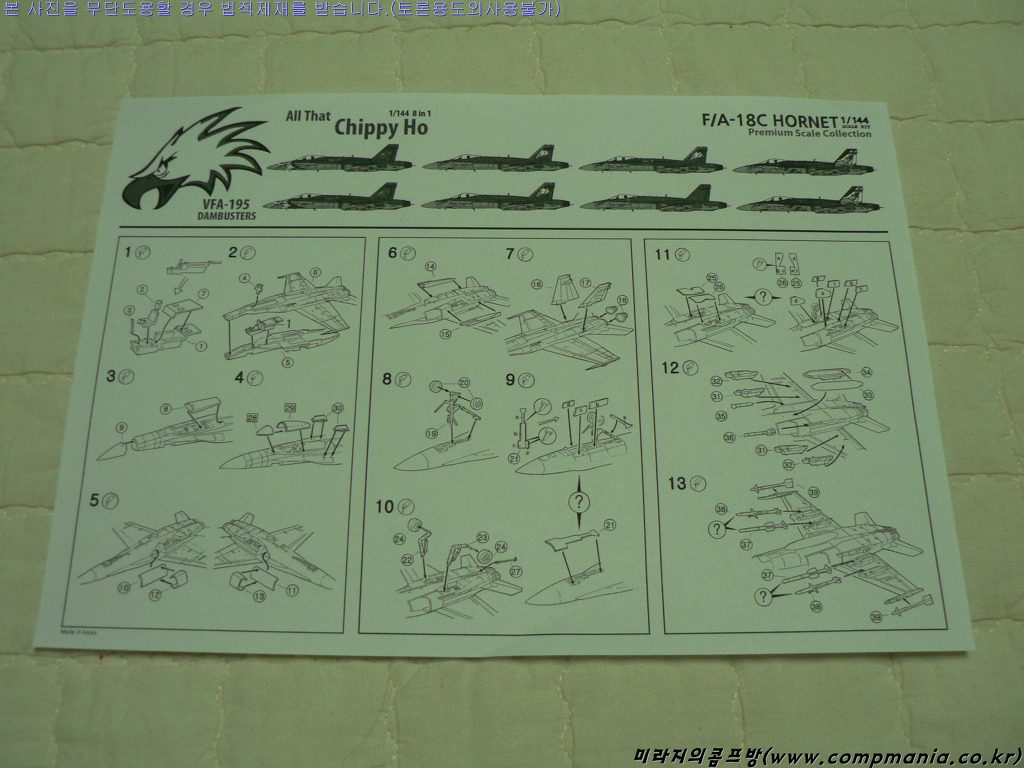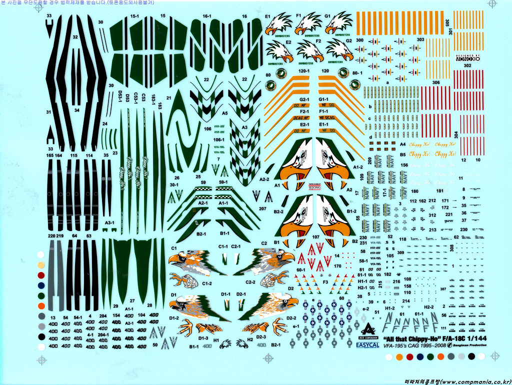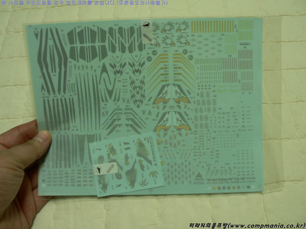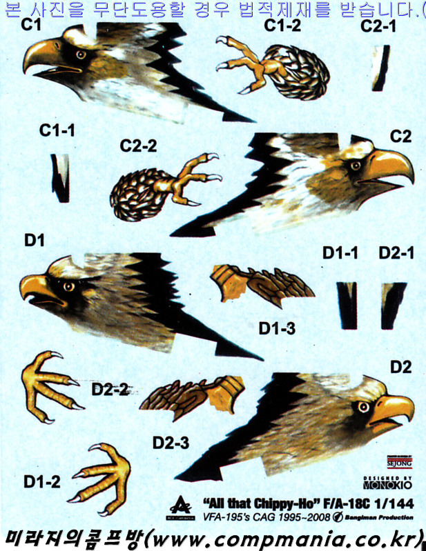 이 제품은 앞서 몇번 소개했듯 에이스코퍼래이션의 명작 1/144 F/A-18C 호넷 제품에다 뱅기만 프로덕션에서 제작한 데칼과 모노키오 에서 제작한 자료집이 추가된 일종의 재포장 제품 입니다.