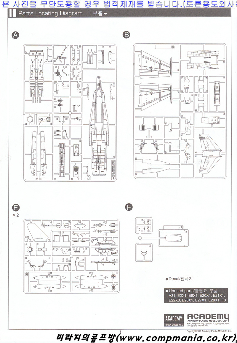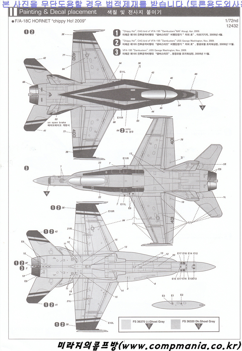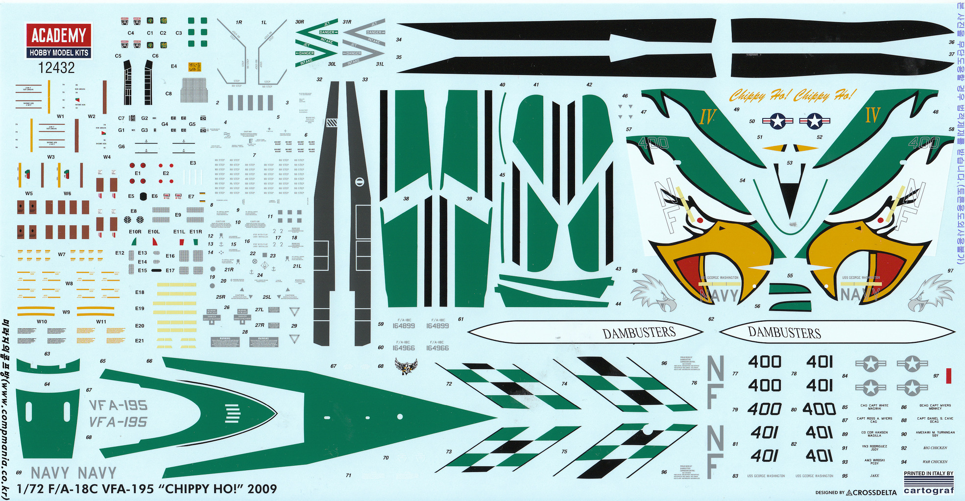 [데칼은 카르토그라프제 데칼이 들어 있습니다.데칼의 품질에 관해서는 흠잡을곳이 없습니다. 디자인은 델타크로스에서 한듯.. 섬세한 재현이 일품 입니다.마킹은 VFA-195 댐버스터스의 대장기인 치피호 2009년도 버젼을 재현중..]