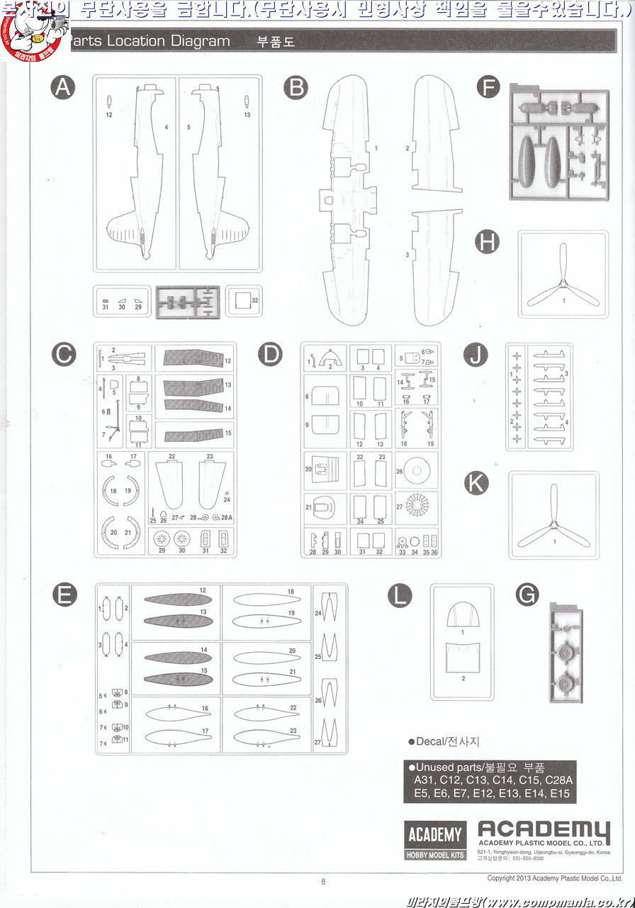 최근 아카데미가 기존 아카데미의 명작킷들을 데칼을 교체하여 출시하여 제품을 출시하는 전략을 자주 쓰는것 같습니다. 나쁘지 않은 방법이하 생각됩니다. 90년대부터 아카데미 에어로 제품은 뛰어난 제품 사출실력에 비햐 너무 떨어지는 데칼의 품질이 늘 지적되곤 했으니까요.. 지금이라도 기존 제품에 데칼을 체이징 하는것만으로 전혀 다른 제품으로 탄생할 명품들이 너무 많습니다.(더구나 데칼이 그 유명한 카르토그라프 데칼이라면 말이 필요없다!) 이번 제품도 그런 제품중 하나라고 할수 있는데 아쉬운 부분은 이왕 업데이트해서 출시하는거 시트의 벨트라도 재현한 작은 에칭부품이라도 추가해줬으면 하는 아쉬움이 남습니다. 어차기 가격도 9천원에 판매하던거 18000원으로 2배나 올렸으면서 말이죠.,