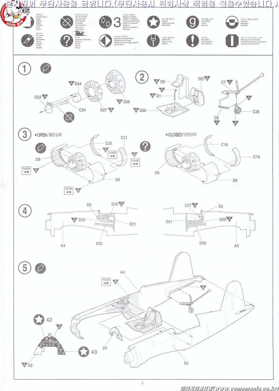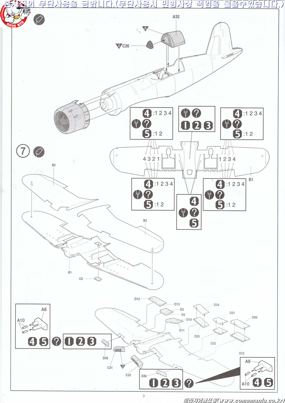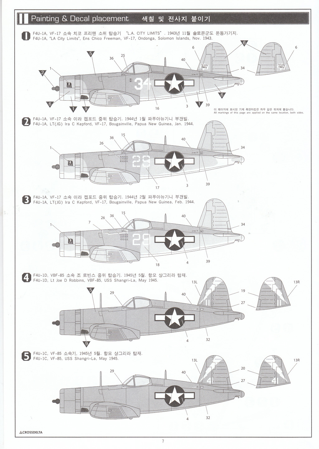 제품 자체는 출시된지 20여년이 다되어가지만 이 제품의 결정판 제품으로 불리는 타미야 제품과 견주어도 크게 뒤지지 않을 정도로 뛰어난 품질을 보이는 제품 입니다. 특히 코르세어의 본격 양산형 모델이라할수 있는 F-4U-1A 형부터 시작해서 성능강화형인 B형과 멀티롤파이터로 사용된 전투폭격기형 D형까지 모두 재현할수 있는 제품이라는 점과 주익의 플랩을 분리재현할수 있다는 점은 큰 매력중 하나였죠.. 다만 이왕 쓰는거 타미야 제품처럼 주익접기가 뒤었더라면 하는 아쉬움이 남습니다.