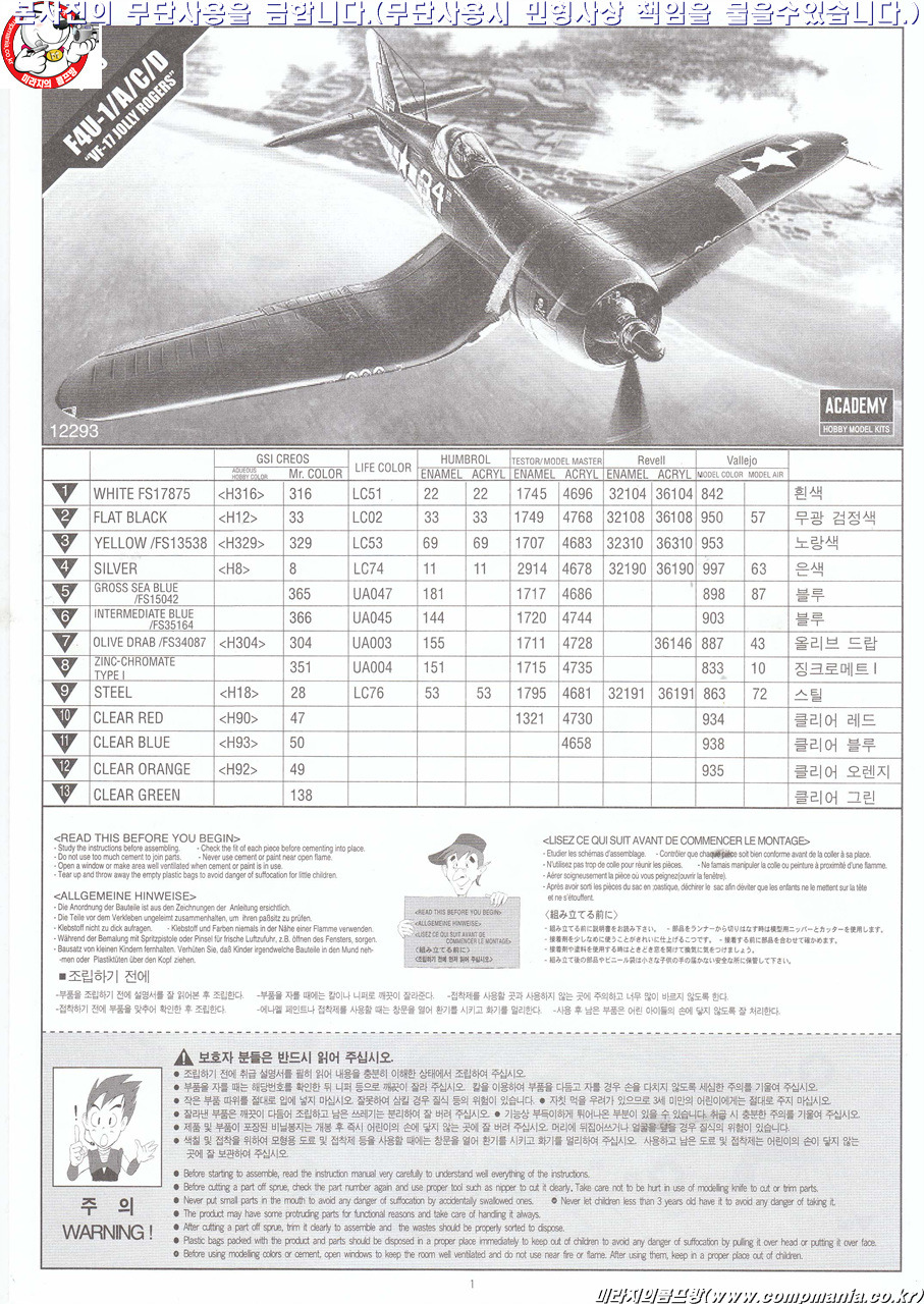 원래 코르세어 제품은 90년대 초반 나온 F-4UB형이 아카데미 오리지날 제품이고 구아이디어과학이 하비그라프트과학으로 이름을 바꾸고 야심차게 1/48 씨리즈 프롭기 씨리즈를 발매하다 90년대말 IMF 사태를 맞아 취미산업쪽이 타격을 입자 파산 이때 다수의 프롭기 제품 금형을 아카데미가 꿀꺽하게 되죠.. 이때 아카데미가 인수한 제품으로는 P-40 시리즈 와 BF-109 B/C/D/E/G형들 그리고 코르세어와 LA-7 등 상당수의 그리고 양질의 품질을 가진 1/48 프롭기 아이템을 인수하여 부실했던 아카데미의 1/48 프롭기 라입얼을 대푹 확장하는데 큰 공헌을 하게 됩니다.