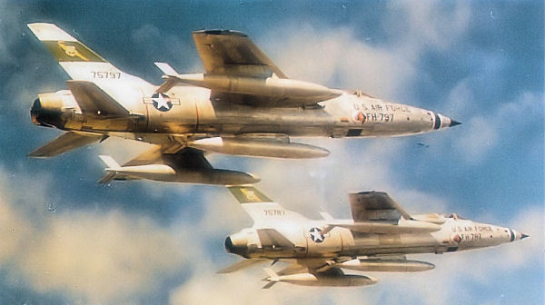 Two Republic F-105B-15-RE Thunderchiefs (AF Serial No. 57-5797 and 57-5787) of the 335th Tactical Fighter Squadron.