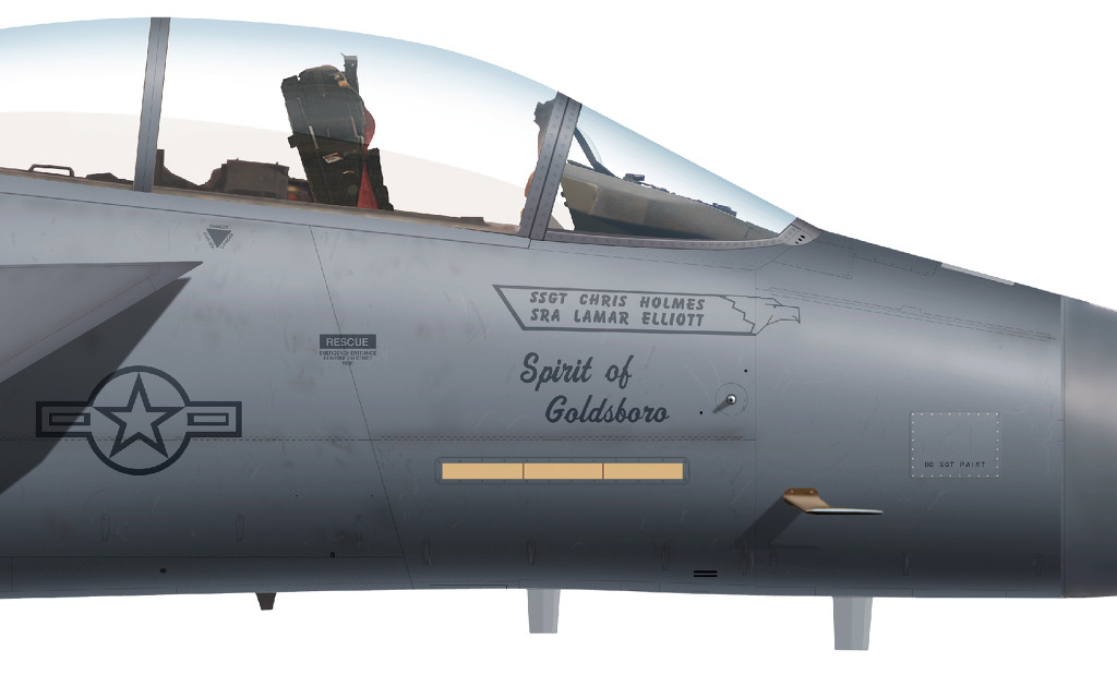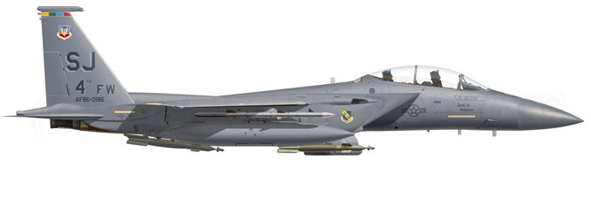 F-15E-42-MC Strike Eagle 'Spirit of Golboro' s/n 86-0186 SJ, 4th TFW assigned to SSgt Chris Holmes and SRA Lamar Elliott