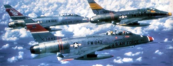 North American F-100C-1-NA Super Sabre, Serial 53-1743 of the 336th TFS (yellow) with two F-100F-10-NA Super Sabres (56-3868, 56–3842) of the 333d TFS (red) of the 4th Tactical Fighter Wing.
