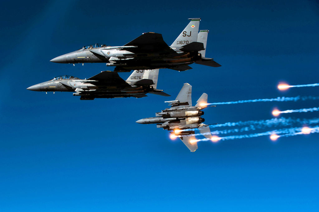 [플레어를 뿌리며 급 이탈중인 F-15E ..F-15E 스트라이크 이글은 현 미공군이 가장 신뢰하는 종심타격기제 입니다.]