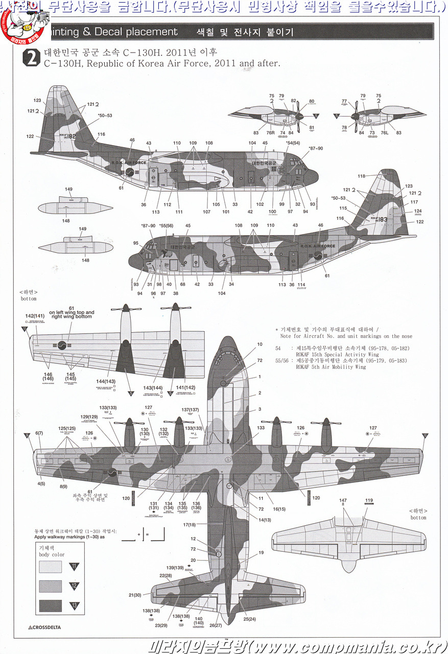 [데칼은 A4 만한게 들어있습니다. 마킹은 제5 수송비행부대와 미공군 제 23수송부대 기체등 3가지 마킹을 재현가능 데칼 디자인 자체는 카르토그라프 디자인으로 유명한 크로스델타사의 디자인이지만 인쇄는 국내인쇄사에서 한 제품입니다. 예전 아카데미 데칼보다는 한결 나아진것 맞지만 지난주 카로트그라프 데칼보다 이걸보니 뭐랄까 할말이 따로 없네요.. 더구나 얼마나 독한 약품처리를 한건지 스캔하고 나니 특유의 약품 (클로로포름 냄새와 비슷) 냄새가 온방안에 가득합니다. 도대체 데칼에 뭘 처바른거냐..? 독하다는 락카냄새에도 까닥없던 미라지도 이 냄새는 못참겠네요..]