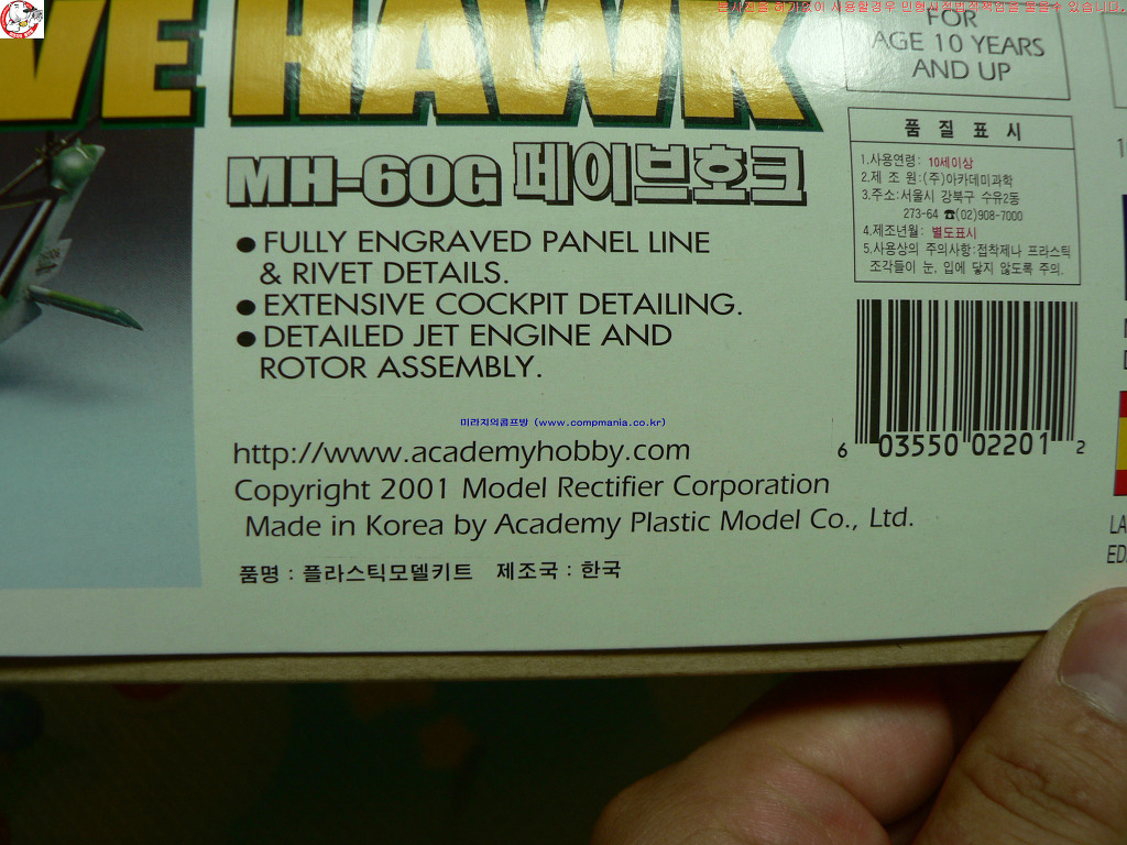 아카데미 UH-60 블랙호크 제품은 2001년 UH-60L 형을 시작으로 2002년 특수전 사양인 MH-60G PAVE HAWK 가 그리고 2005년경 공격헬기타입인 AH-60L ADP 타입이 그리고 2009년경 한정판 사양인 UH-60P 한국군 사양 그리고 올해에 드디어 5번째 아이템인 MH-60S 가 출시되는셈 입니다. 곁다리 식으로 2004년경에 이탈래리에서 나온제품은 데칼만 이태리제로 바뀐제품고 대만의 AFV 클럽에서 나온 S-70 제품은 아카데미 UH-60L 에 레진부품과 데칼이 추가된 버젼 입니다.