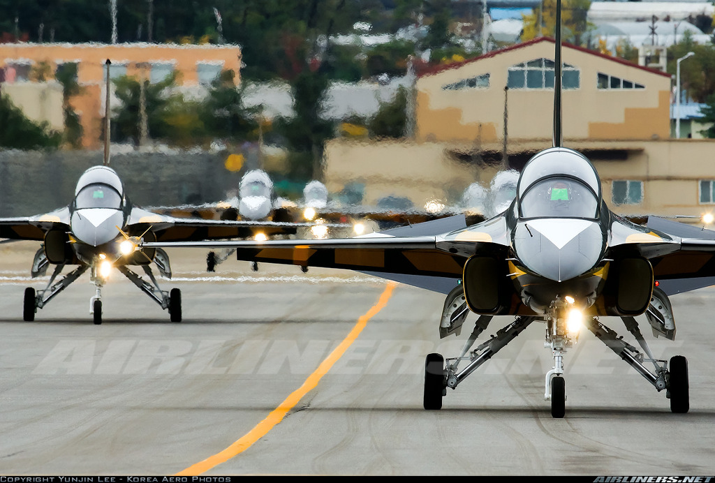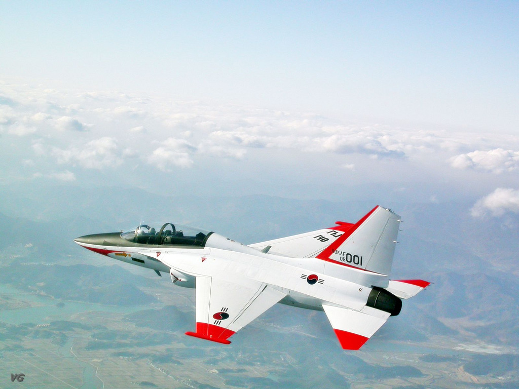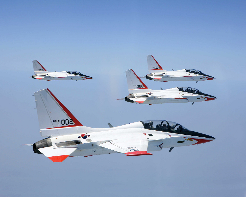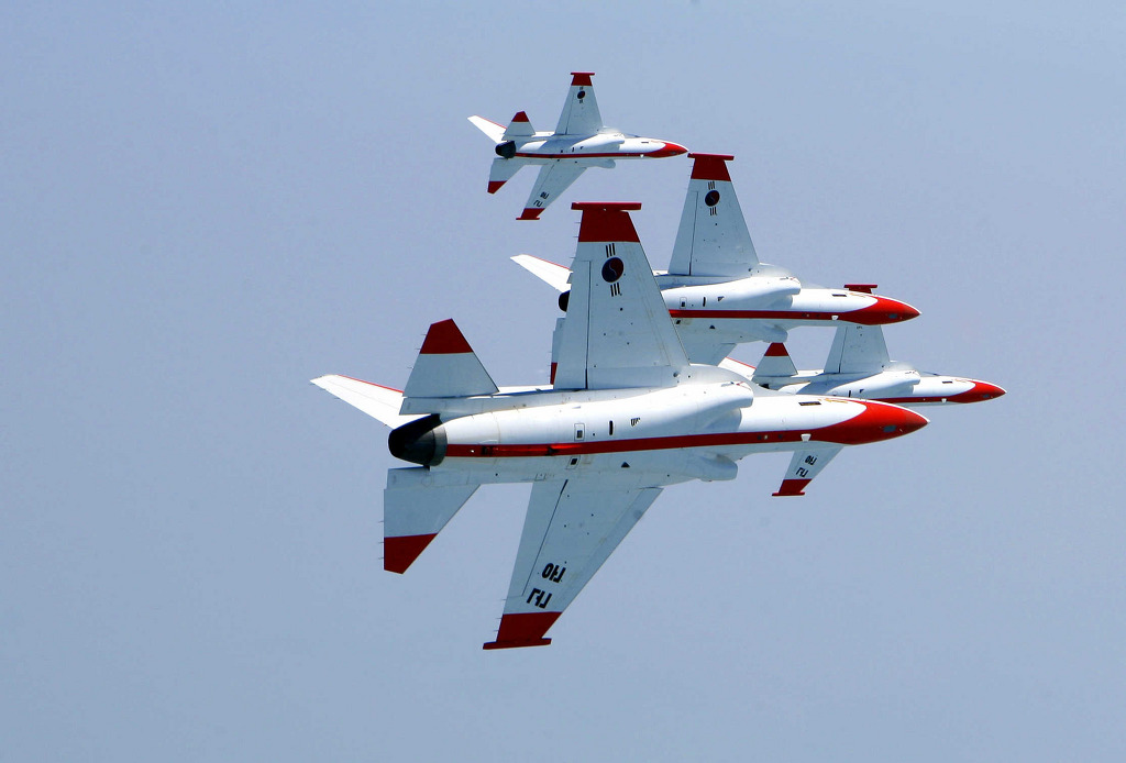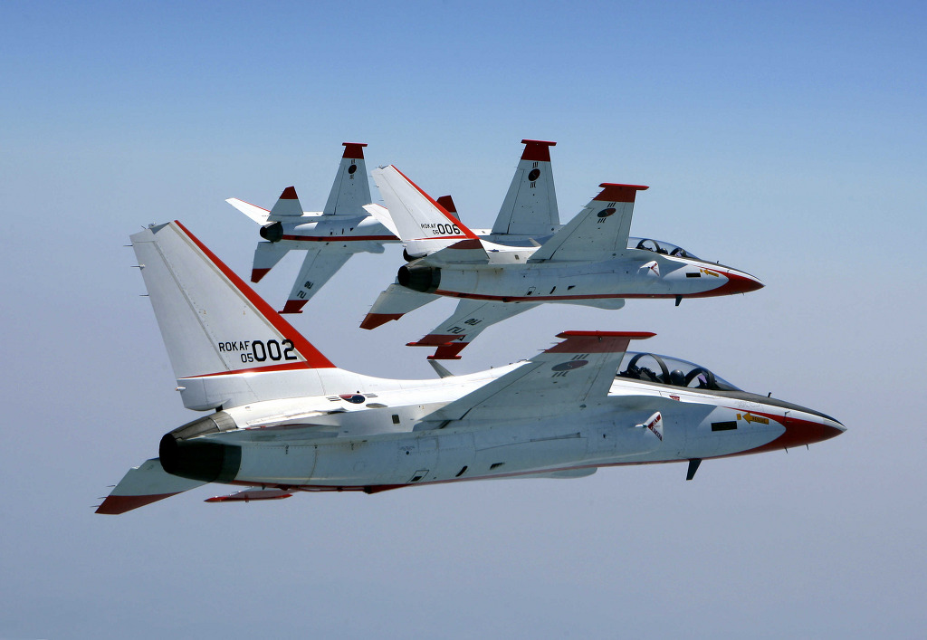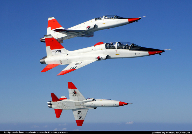 [편대비행중인 T-50들의 모습 ..T-50의 개발성공으로 대한민국은 전세계에서 6번째로 초음속 항공기를 수출한 국가로 이름을 남기게 되었다. T-50은 F-16과 상당히 유사한 조종환경을 가지고 있어 이들 기체를 운용하는 국가들에 있어 새로운 훈련기로서 가치가 높다 즉, T-50으로 조종교욱을 받은 조종사들은 별도의 전환교육없이 바로 F-16 을 조종할수 있는것이다]