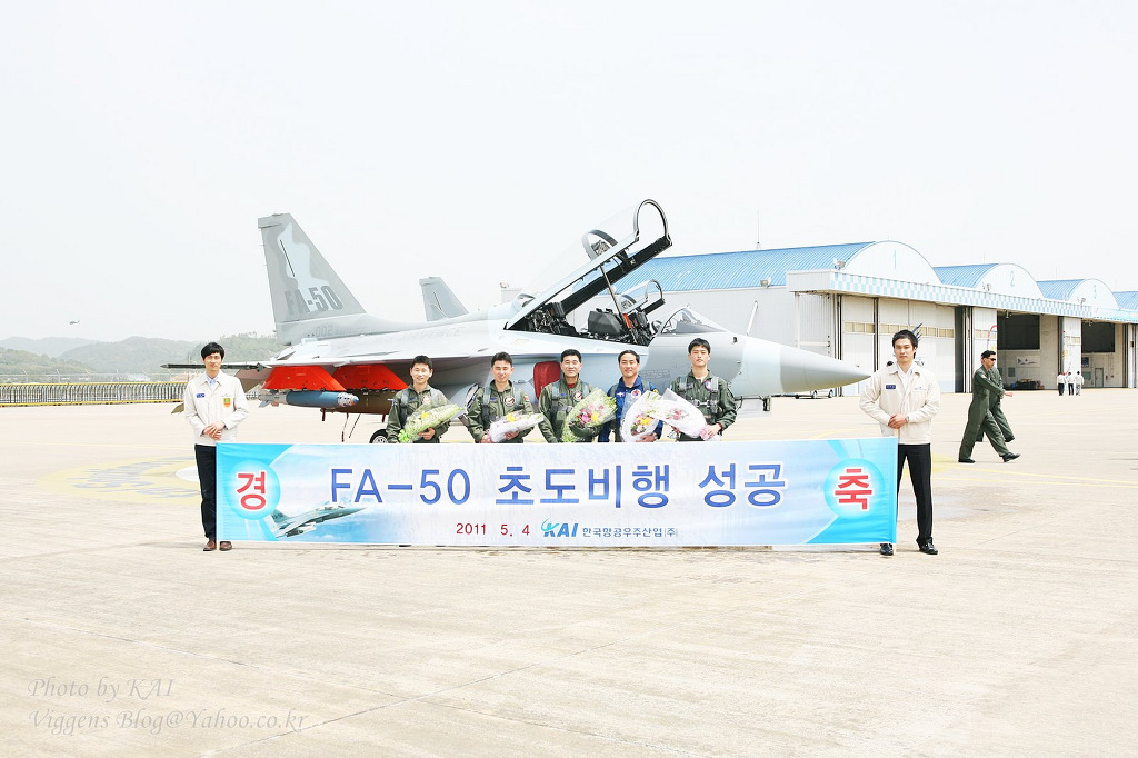 [FA-50은 이미 개발한 TA-50 시제기를 활용해 체계를 설계하고 개발한 것으로, 공격임무를 수행하는 FA-50은 경제적인 개발을 위해 최대한 공통성을 유지하도록 설계한 것이 특징이다.사진은 지난 2011년 5월4일 최초의 시험비행을 성공리에 마친 F/A-50의 시험비행후 찍은 기념사진]