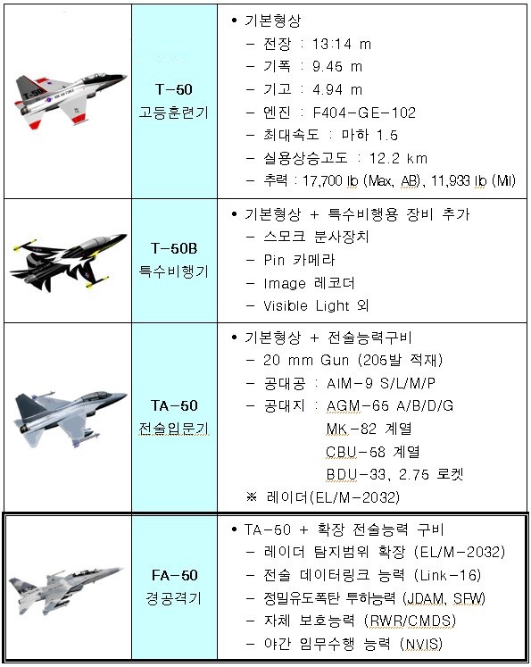 초음속 수송기 만들것도 아니니 괜찮을지도? - [11] T-50을 못마땅해 하는 사람들의 경우 고등훈련기를 가지고 경공격기를 만드니까 문제가 많이 생길 것이라는 말을 종종 하는데, 이는 T-50의 개발 목적을 잘 몰라서 하는 이야기이다. 더불어 이런 식으로 개발되는 것은 비단 T-50뿐만은 아니며 일본의 T-2/F-1을 비롯하여 유사사례가 제법 있다.