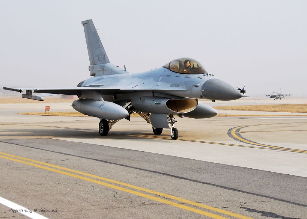 [이륙을 위해 택싱웨이를 할주중인 KF-16C 형의 모습 이는 도입 당시 최신의 블록 52형을 기반으로 한국사양에 맞게 개량된 타입이다. 당시로는 최강의 전투기 사양중 하나였지만 나중에 도입된 F-15K 에 비해서는 경량전투기의 한계를 보여주는 기체이기도 했다 마치 2000cc자동차와 4000cc 급 대형차와 비슷한 경우라 하겠다.어찌되었던 이들 전투기의 도입사업으로 인해 국내항공산업을 큰 경험을 얻게되었으며 이는 훗날 KT-1의 개발과 이어 KTX-2 로 이어지는 성과를 거두게 된다]